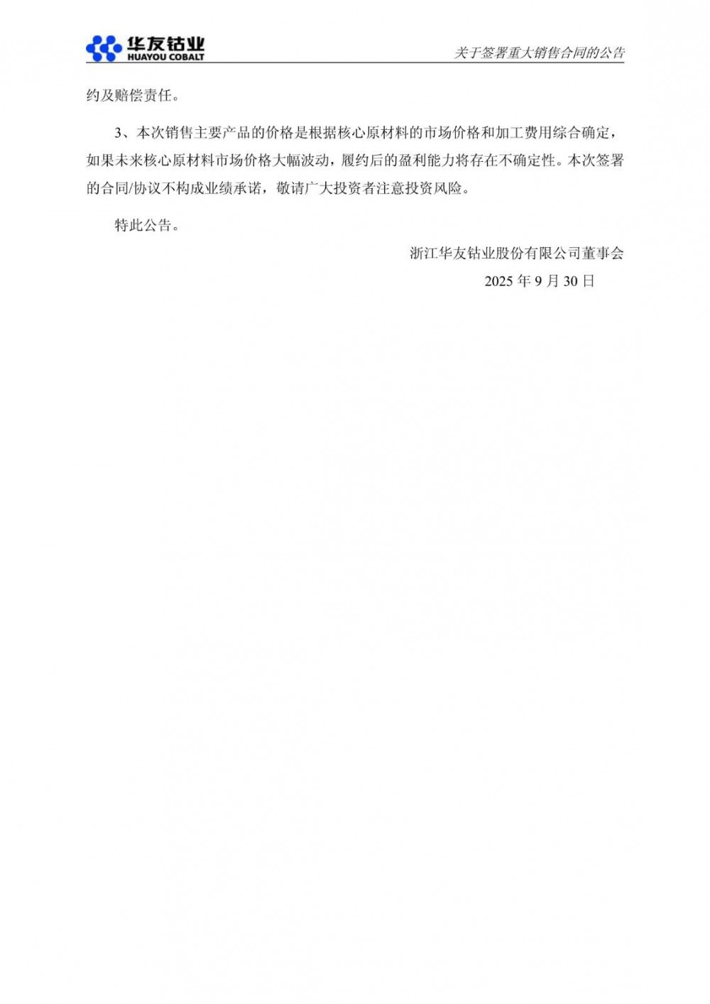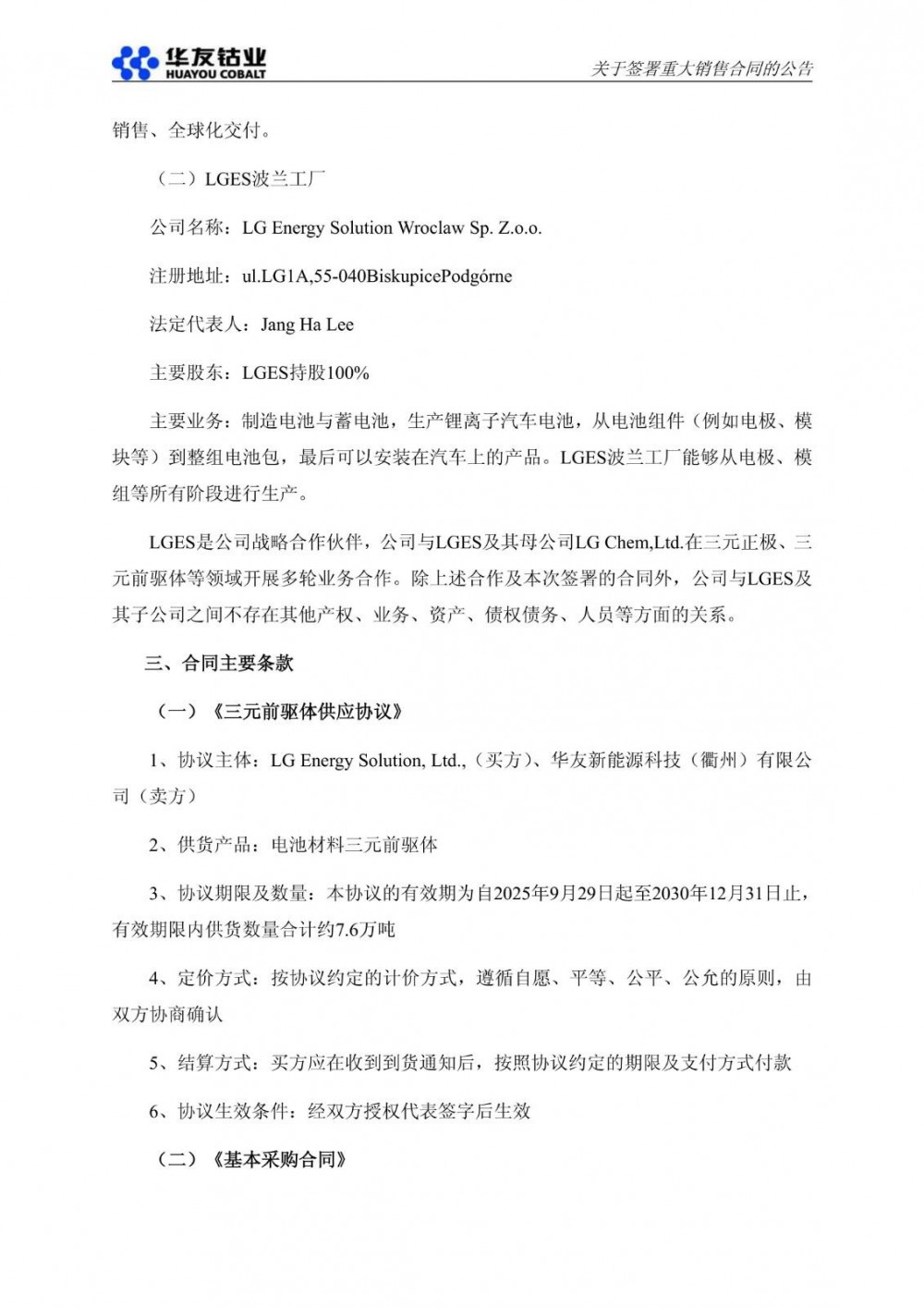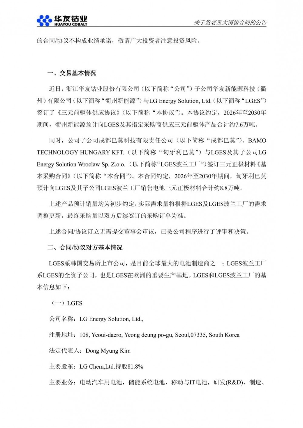 9月29日,华友钴业发布公告称,公司子公司衢州新能源与LGES签订《三元前驱体供应协议》,约定衢州新能源于2026年至2030年期间向LGES及其指定采购商供应三元正极前驱体产品合计约7.6万吨。同时,公司子公司成都巴莫及匈牙利巴莫与LGES及其子公司LGES波兰工厂签订三元正极材料《基本采购合同》,约定匈牙利巴莫于2026年至2030年期间向LGES及LGES波兰工厂供应电池三元正极材料产品合计约8.8万吨。