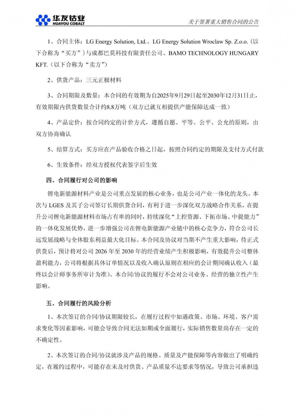华友钴业表示,锂电新能源材料产业是公司重点发展的核心业务,也是公司产业一体化的龙头。本次与LGES及其子公司签订长期供货合同,有利于进一步深化双方战略合作关系,在提升公司锂电新能源材料市场占有率的同时,持续深化“上控资源、下拓市场、中提能力”的一体化发展优势,进一步增强公司在锂电新能源产业链中的核心竞争力,符合公司长远发展战略与全体股东利益最大化目标。本合同及协议对当期不产生重大影响,待正式供货后,预计将对公司2026年至2030年的经营业绩产生积极影响,有效提升公司整体盈利能力,公司将根据具体订单情况以及收入确认原则在相应的会计期间确认收入(最终以会计师事务所审计为准)。