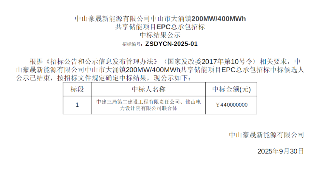 碳索储能网获悉,9月30日,中山豪晟新能源有限公司中山市大涌镇200MW/400MWh共享储能项目EPC总承包发布招标中标结果公告。