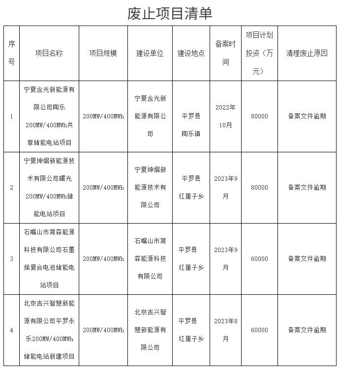 为推动我县新能源产业高质量发展,促进资源节约集约利用,按照《自治区发展改革委关于促进储能健康发展的通知》(宁发改能源(发展)〔2024〕816号)文件中关于“备案超过两年未开工建设的或者未办理任何其他手续的,其备案文件自动失效”要求,现对4个新型储能项目予以废止。有关项目情况公告如下: