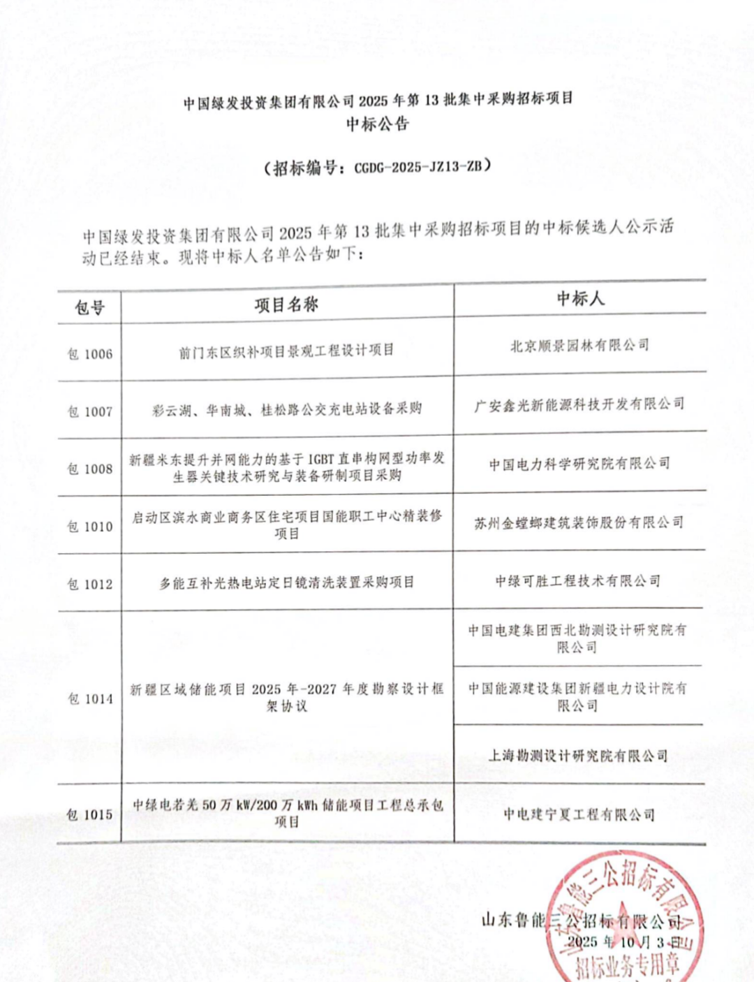 近日,中国绿发投资集团有限公司2025年第13批集中采购招标项目中标公告发布。