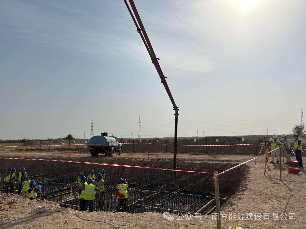 奥比项目区:作为乌兹三期储能项目群中的 “先行官”,建设进展成效显著。当地时间9月30日14时28分,纳曼干州奥比储能项目现场,随着首方混凝土缓缓注入储能电池舱基础,该项目正式从基础施工阶段迈入主体建设阶段,成为项目群中首个突破关键建设节点的项目,刷新乌兹别克斯坦大型储能项目建设纪录。施工期间,我司管理团队实行 “昼夜奋战、两班倒作业” 模式,统筹多台机械设备协同攻坚,在严格保障施工质量与作业安全的前提下,高效推进基础施工;当前,奥比项目正同步攻坚储能区基础施工,形成 “基础攻坚与主体工序筹备同步衔接、高效联动” 的建设格局,为后续储能电池舱安装等关键工序筑牢根基。