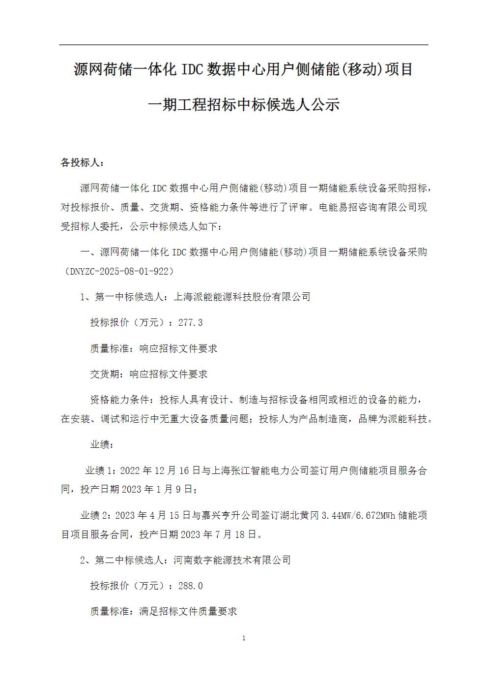 10月11日,国家电投集团综合智慧能源科技有限公司发布源网荷储一体化IDC数据中心用户侧储能(移动)项目一期工程招标中标候选人公示。