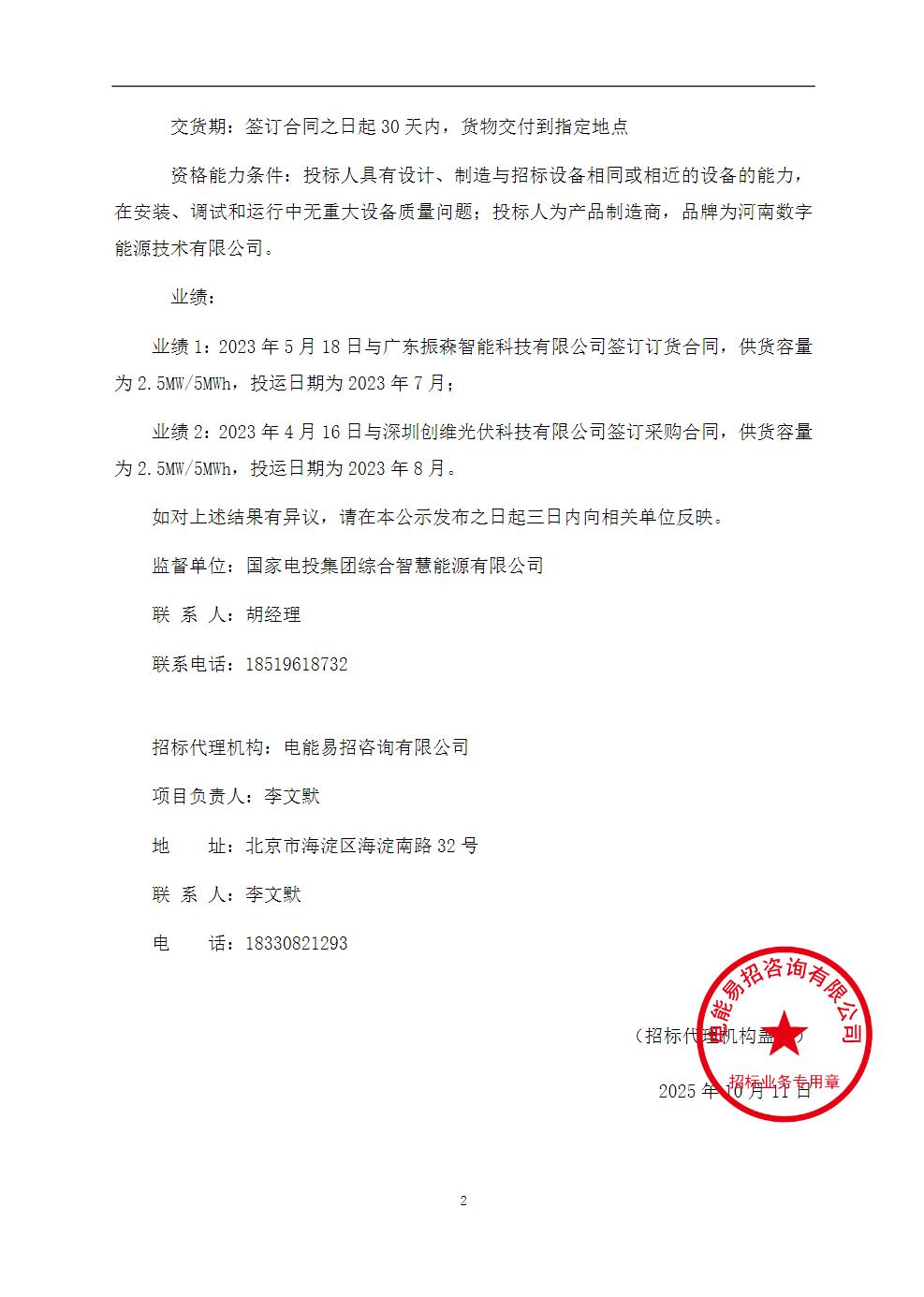 第二中标候选人为河南数字能源技术有限公司,投标报价288万元,折合单价0.576元/Wh。