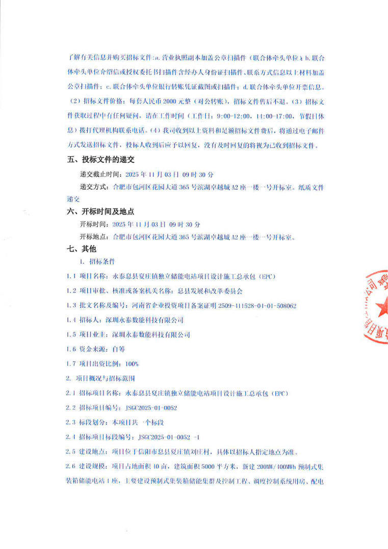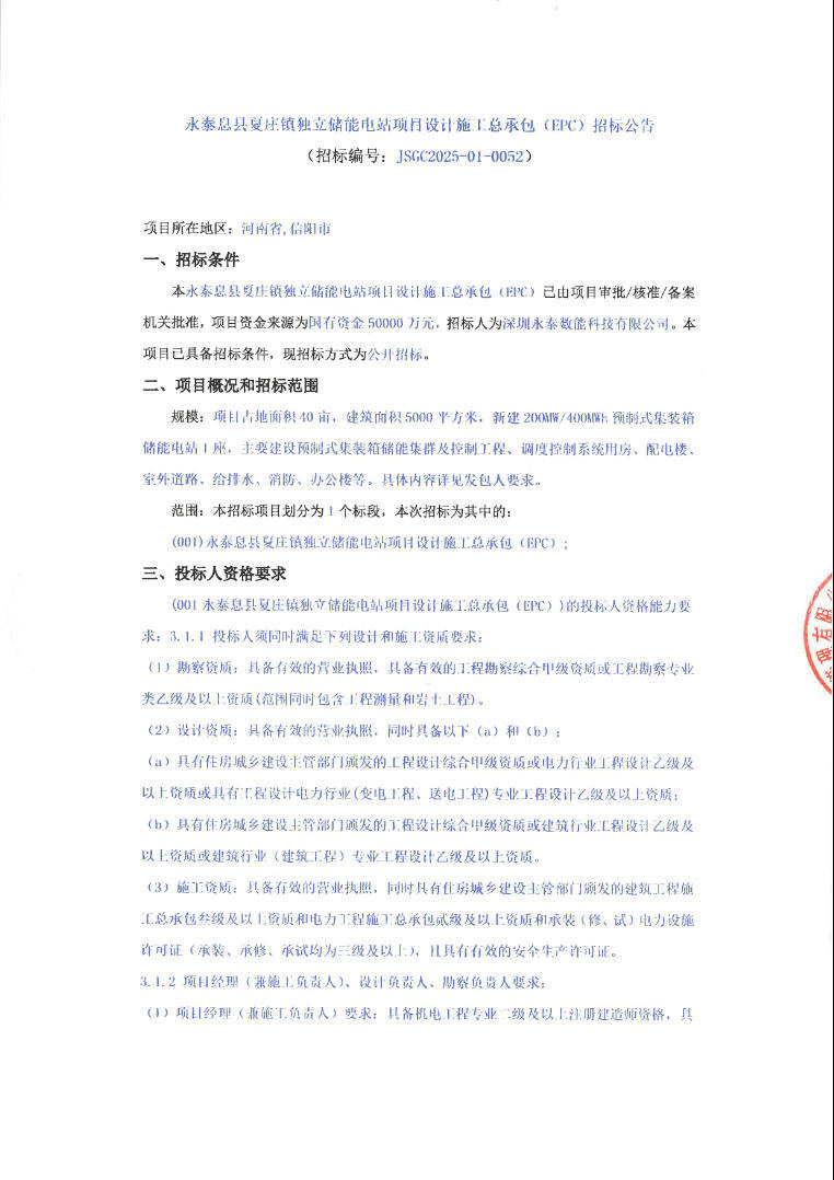 10月13日,永泰息县夏庄镇独立储能电站项目设计施工总承包(EPC)招标公告发布。