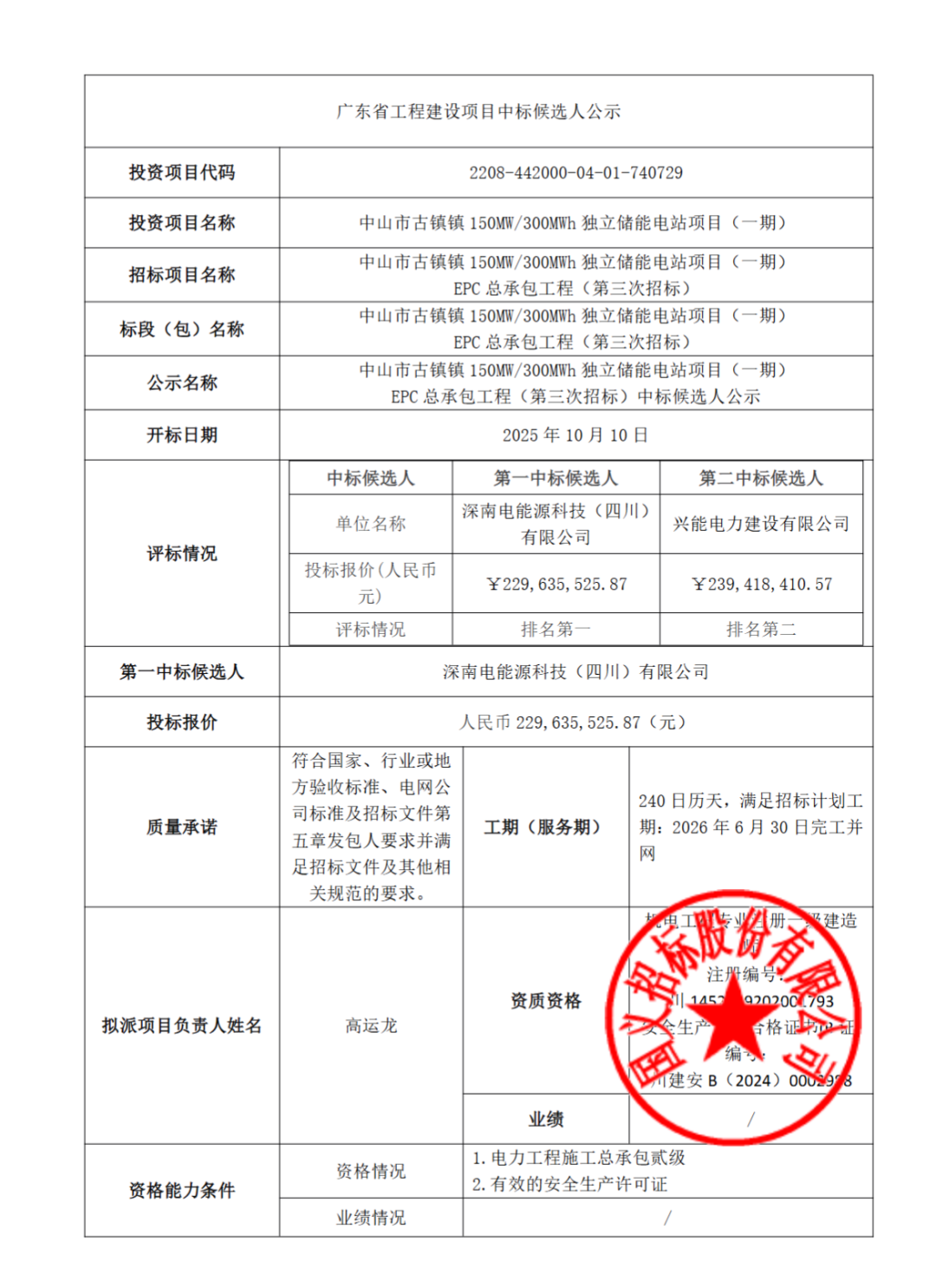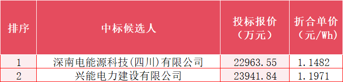 公告显示,项目第一中标候选人为深南电能源科技(四川)有限公司,投标报价为22963.55万元,折合单价为1.1482元/Wh;