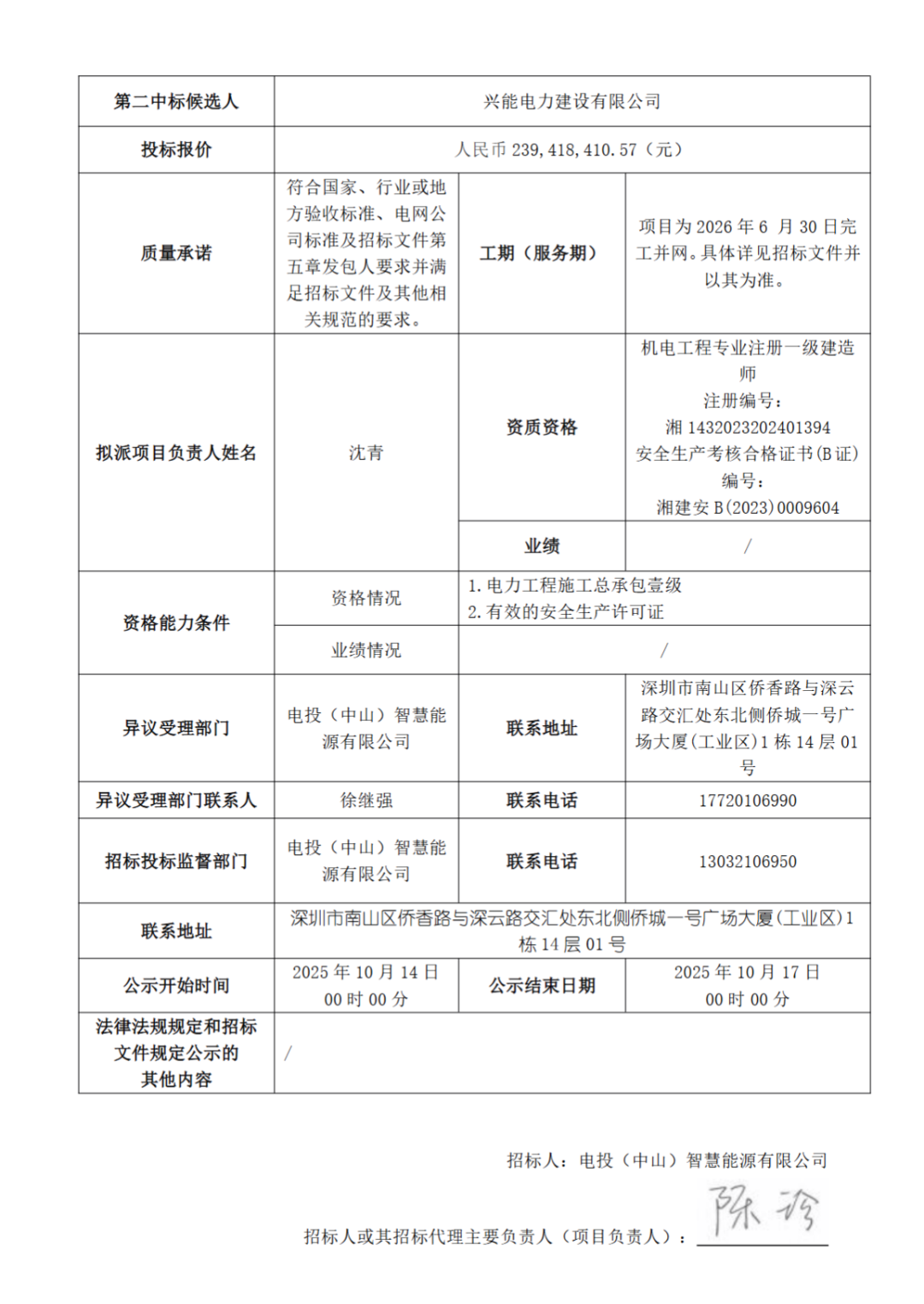 第二中标候选人为兴能电力建设有限公司,投标报价为23941.84万元,折合单价为1.1971元/Wh,具体见下: