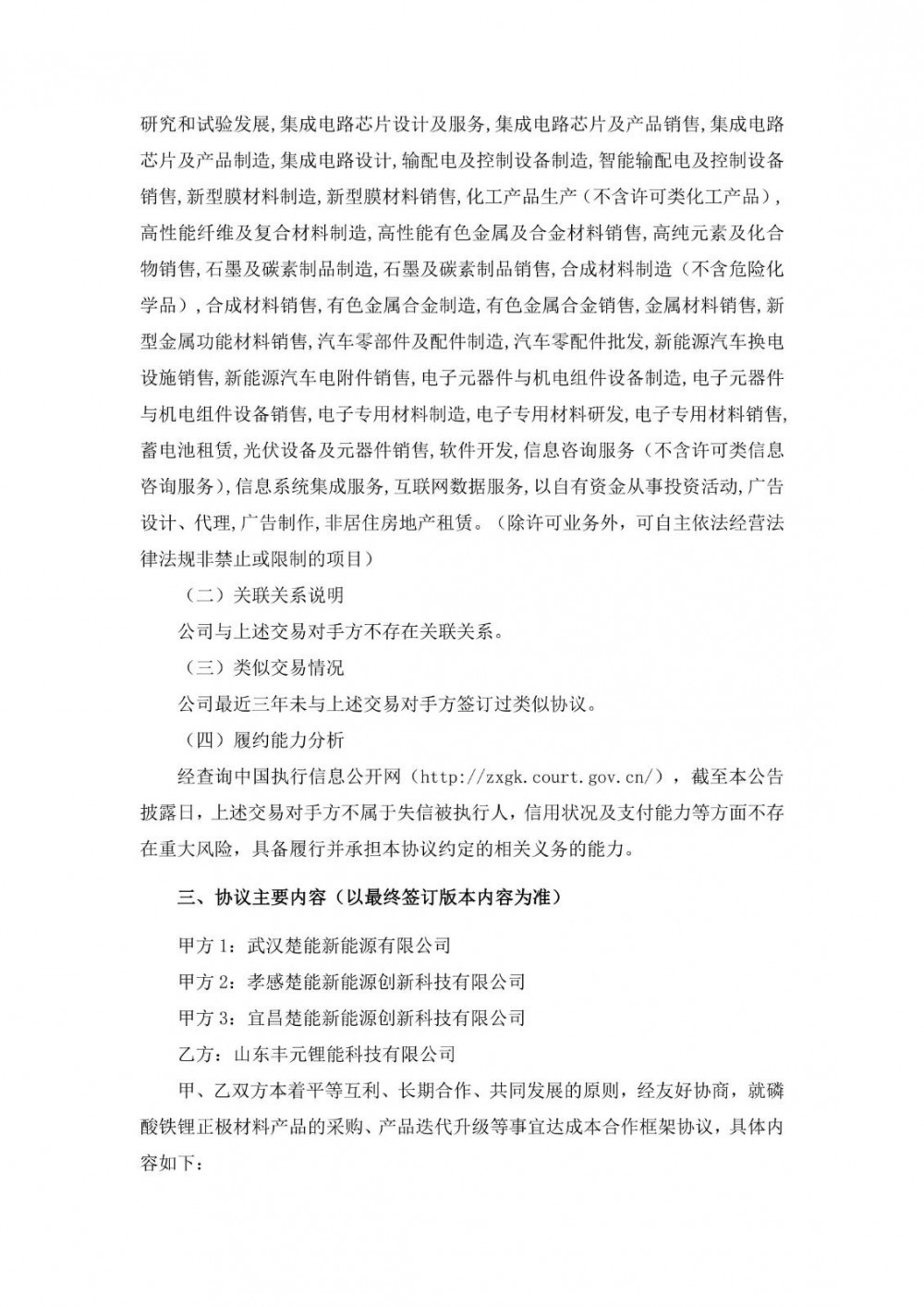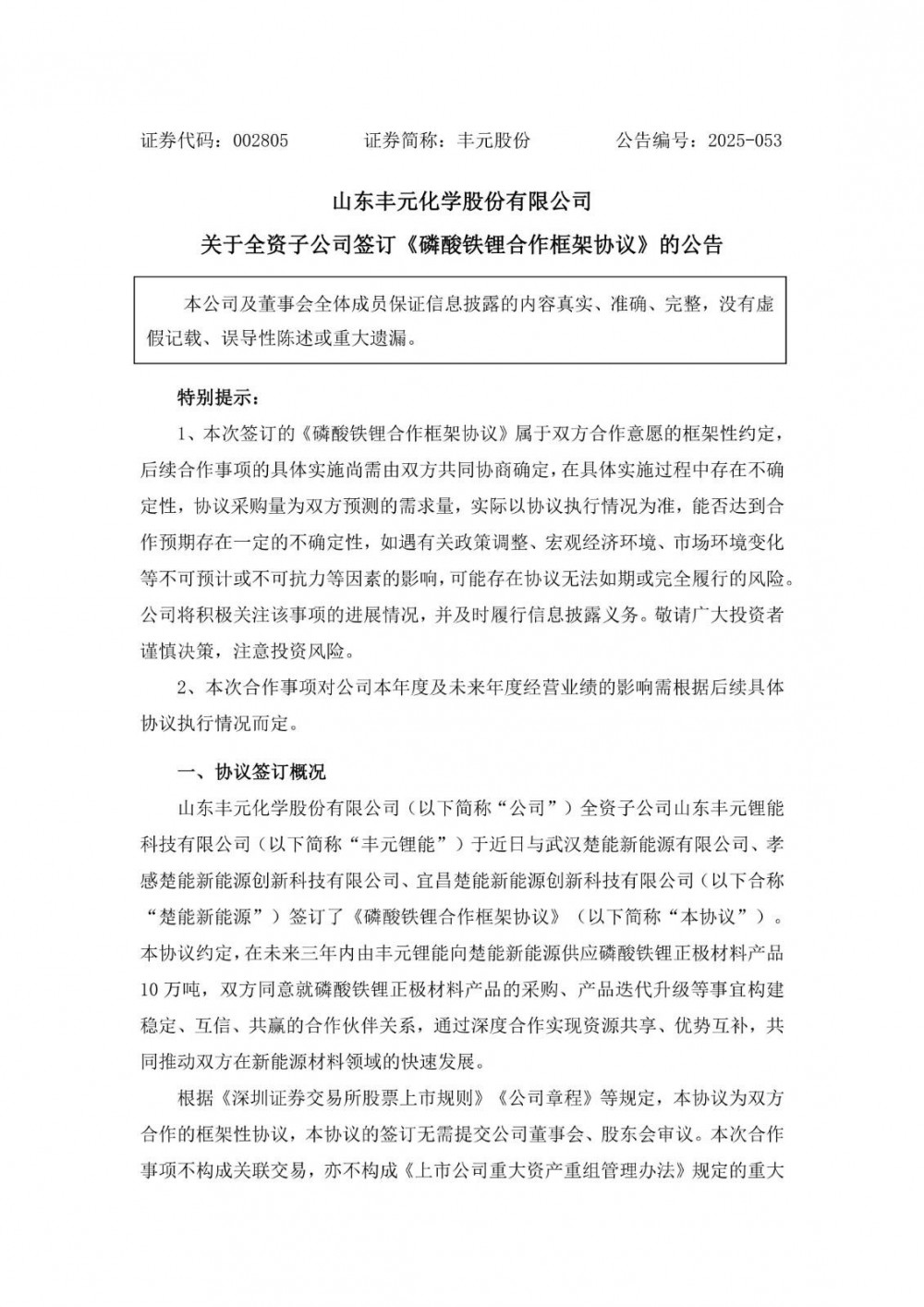 10月20日,丰元股份发布公告称,公司全资子公司山东丰元锂能科技有限公司于近日与武汉楚能新能源有限公司、孝感楚能新能源创新科技有限公司、宜昌楚能新能源创新科技有限公司签订了《磷酸铁锂合作框架协议》。本协议约定,在未来三年内由丰元锂能向楚能新能源供应磷酸铁锂正极材料产品10万吨,双方同意就磷酸铁锂正极材料产品的采购、产品迭代升级等事宜构建稳定、互信、共赢的合作伙伴关系,通过深度合作实现资源共享、优势互补,共同推动双方在新能源材料领域的快速发展。