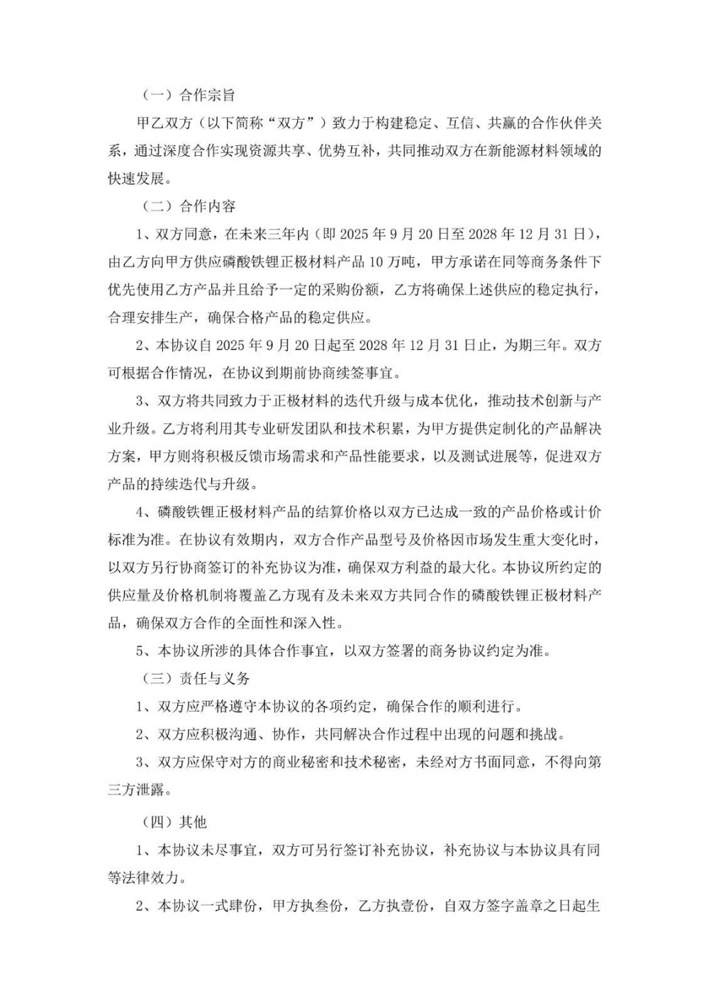 双方将共同致力于正极材料的迭代升级与成本优化,推动技术创新与产业升级。乙方将利用其专业研发团队和技术积累,为甲方提供定制化的产品解决方案,甲方则将积极反馈市场需求和产品性能要求,以及测试进展等,促进双方产品的持续迭代与升级。