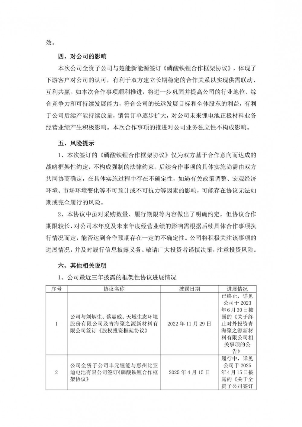 丰元股份表示,本次公司全资子公司与楚能新能源签订《磷酸铁锂合作框架协议》,体现了下游客户对公司的认可,有利于双方建立长期稳定的合作关系以实现供需联动、互利共赢。如本次合作事项顺利推进,将进一步巩固并提高公司的行业地位、综合竞争力和可持续发展能力,符合公司的长远发展目标和全体股东的利益,有利于公司后续产能持续放量,销售订单逐步扩大,对公司未来锂电池正极材料业务经营业绩产生积极影响。本次合作事项的推进对公司业务独立性不构成影响。