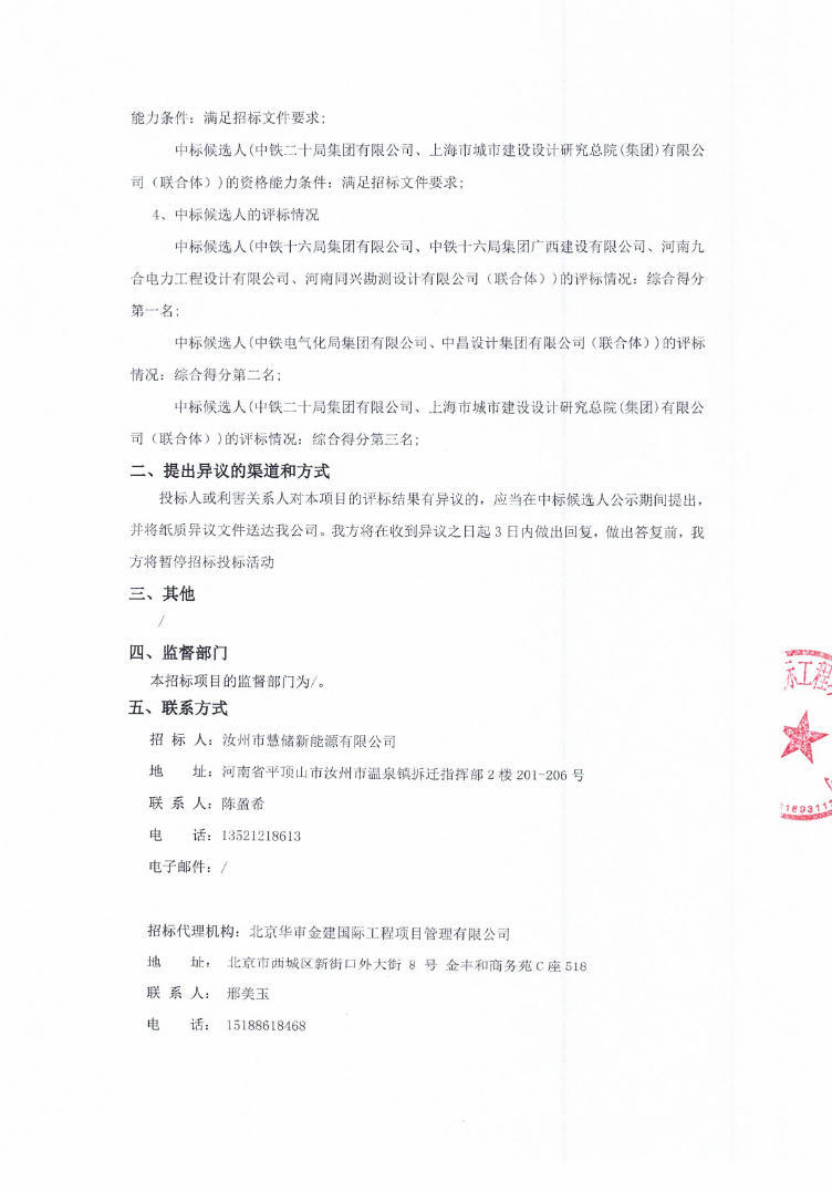 河南汝州市温泉镇200MW/400MWH独立储能EPC工程中标候选人公示