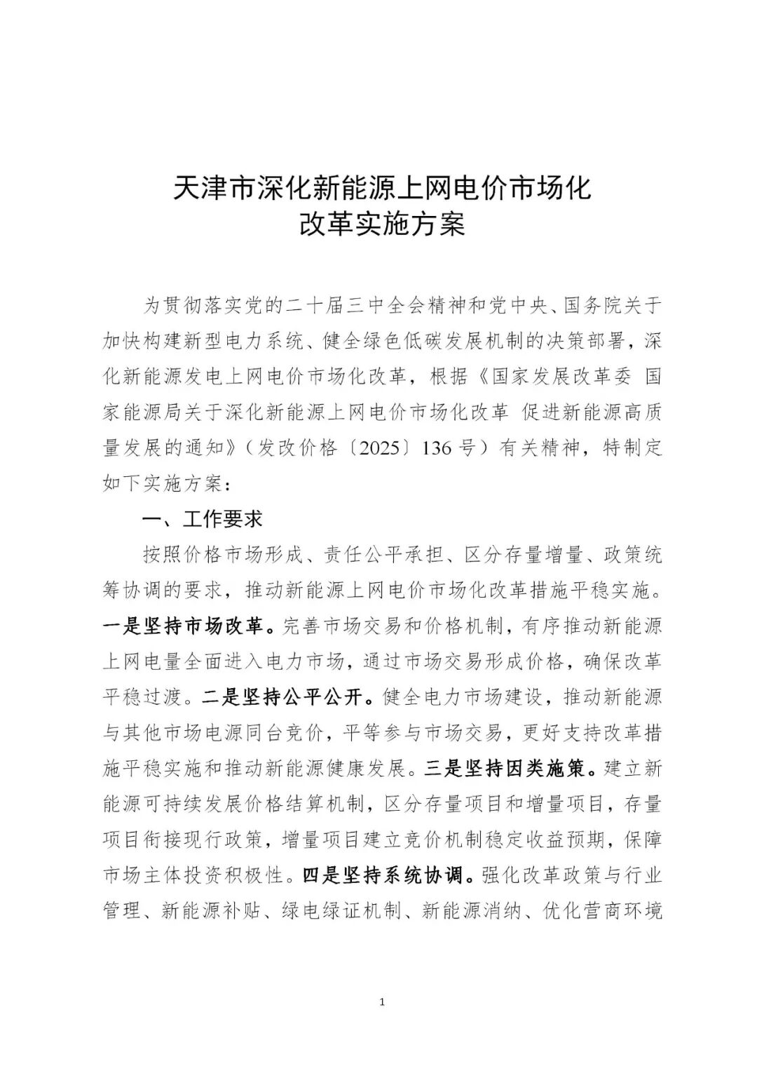 关于印发《天津市深化新能源上网电价市场化改革实施方案》的通知正式发布