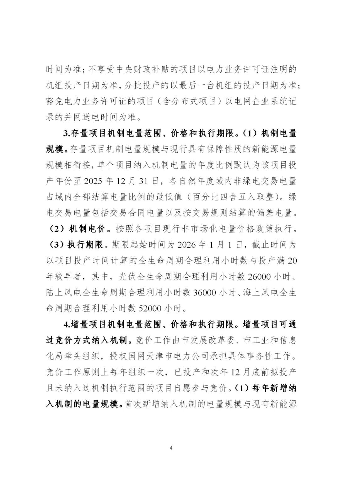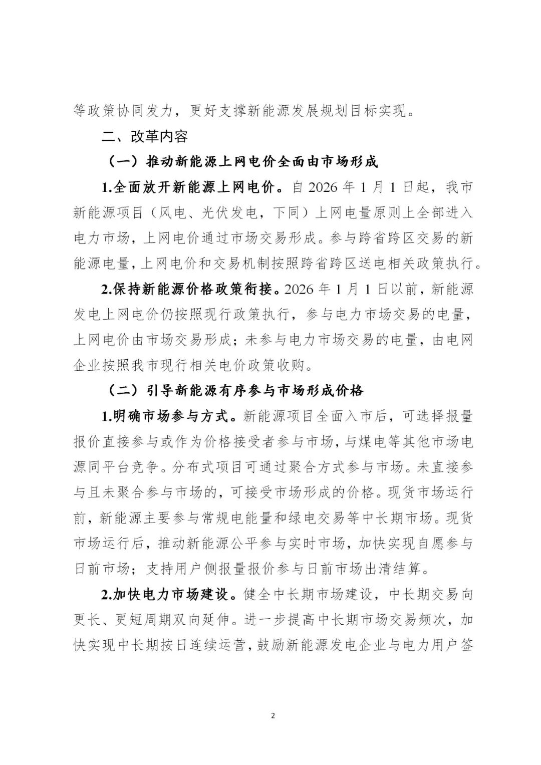 《天津市深化新能源上网电价市场化改革实施方案》明确,自2026年1月1日起,天津市新能源项目(风电、光伏发电,下同)上网电量原则上全部进入电力市场,上网电价通过市场交易形成。参与跨省跨区交易的新能源电量,上网电价和交易机制按照跨省跨区送电相关政策执行。