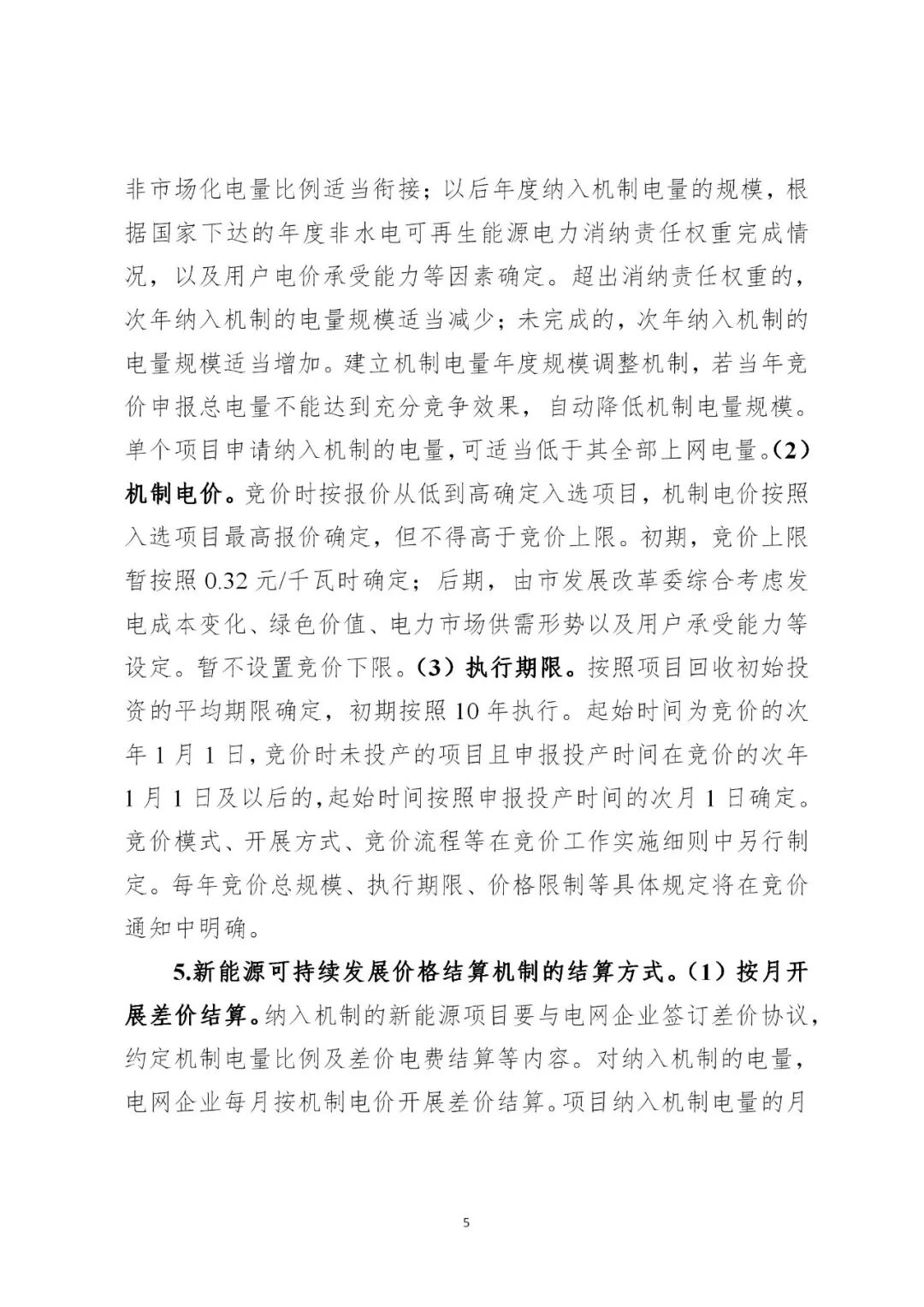 机制电价:竞价时按报价从低到高确定入选项目,机制电价按照入选项目最高报价确定,但不得高于竞价上限。初期,竞价上限暂按照0.32元/千瓦时确定;后期,由市发展改革委综合考虑发电成本变化、绿色价值、电力市场供需形势以及用户承受能力等设定。暂不设置竞价下限。