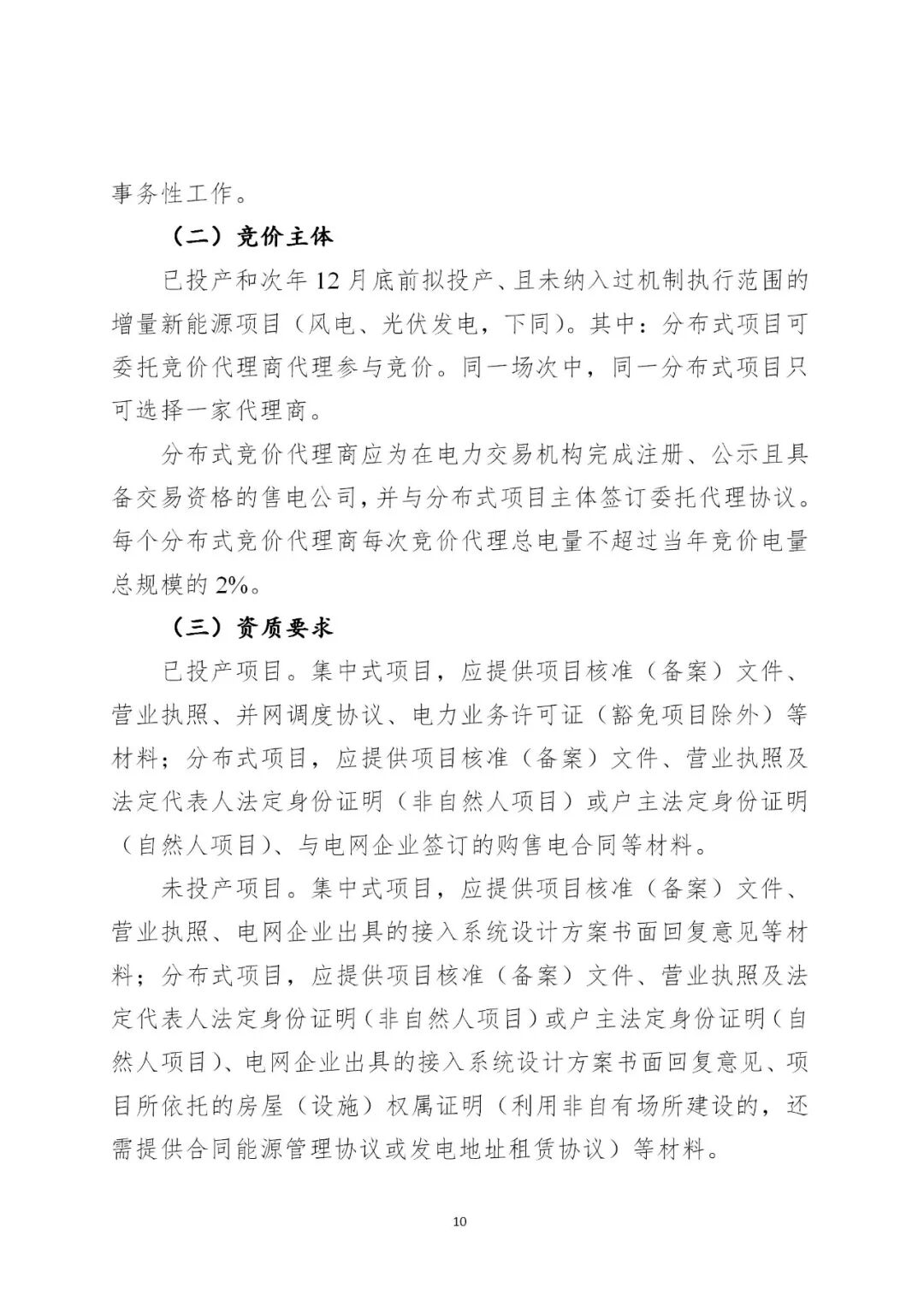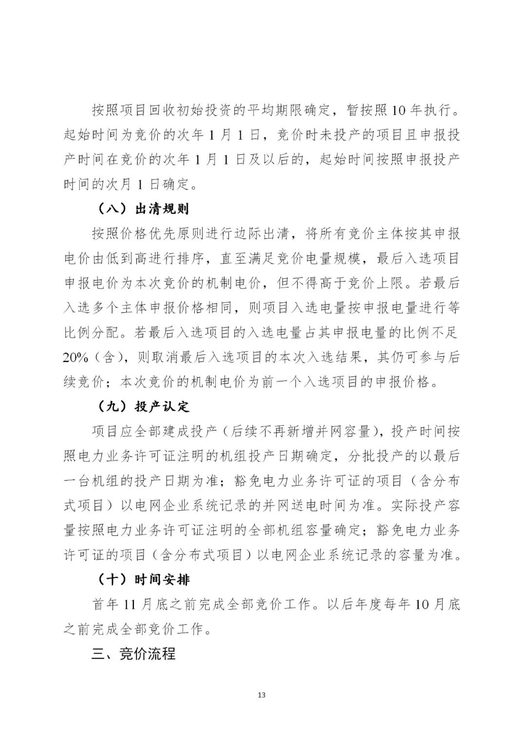 执行期限:按照项目回收初始投资的平均期限确定,初期按照10年执行。起始时间为竞价的次年1月1日,竞价时未投产的项目且申报投产时间在竞价的次年1月1日及以后的,起始时间按照申报投产时间的次月1日确定。竞价模式、开展方式、竞价流程等在竞价工作实施细则中另行制定。每年竞价总规模、执行期限、价格限制等具体规定将在竞价通知中明确。