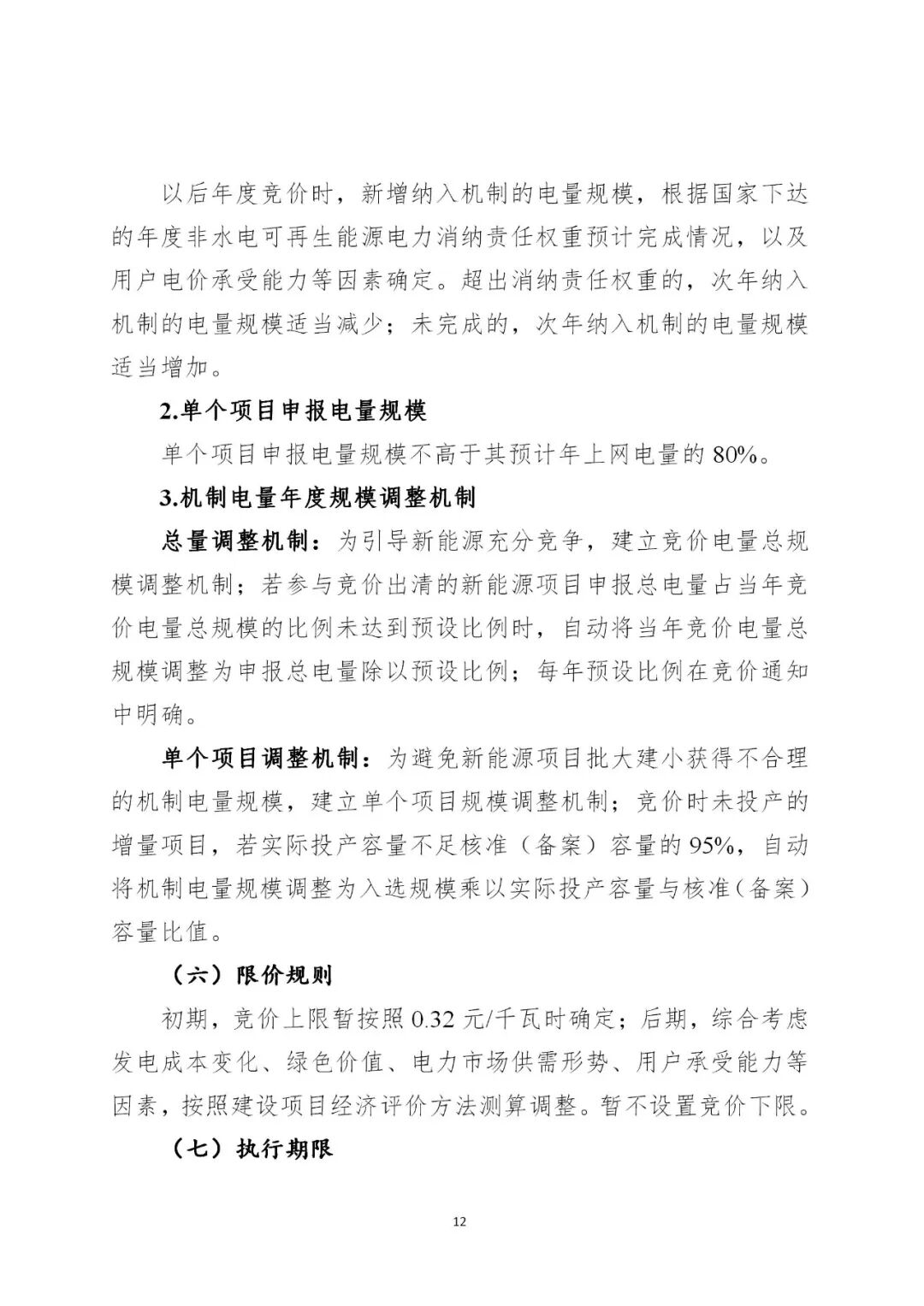 初期,竞价上限暂按照0.32元/千瓦时确定;后期,综合考虑发电成本变化、绿色价值、电力市场供需形势、用户承受能力等因素,按照建设项目经济评价方法测算调整。暂不设置竞价下限。