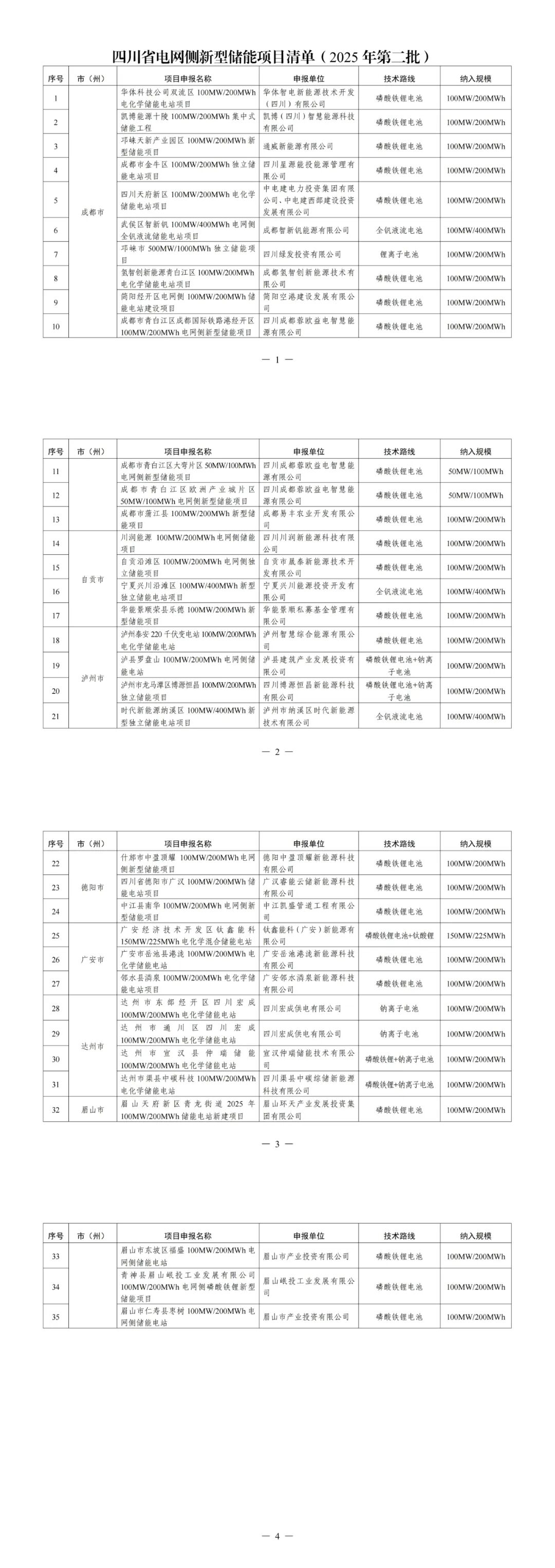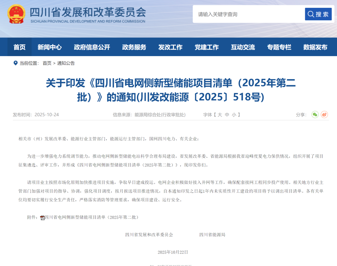 10月24日,四川省电网侧新型储能项目清单(2025年第二批)正式发布。
