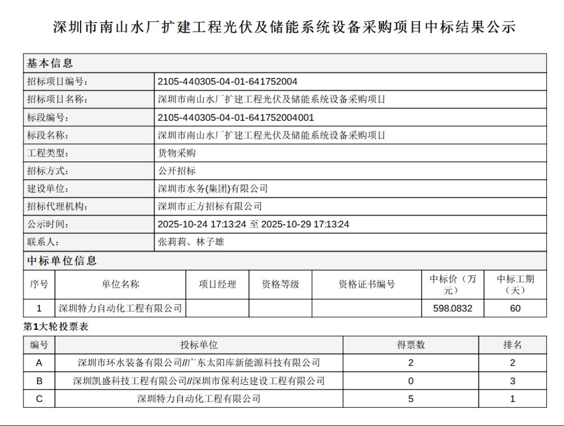 碳索储能网获悉,10月24日 ,深圳市南山水厂扩建工程光伏及储能系统设备采购项目中标结果公示,中标单位为深圳特力自动化工程有限公司,中标价格598.0832万元,工期为60天。