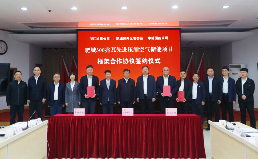 10月21日下午,浙江油田公司、肥城市经济开发区管委会、中储国能公司三方在杭州共同签署先进压缩空气储能项目框架合作协议。根据协议,三方本着企地协同、资源共享,优势互补的原则,共同推进浙江油田首个300兆瓦盐穴压缩空气储能项目落户泰安肥城。浙江油田公司党委副书记、总经理郭建设,中国科学院工程热物理研究所所长陈海生、肥城市经开区党工委书记、管委会主任董振出席活动并见证签约。