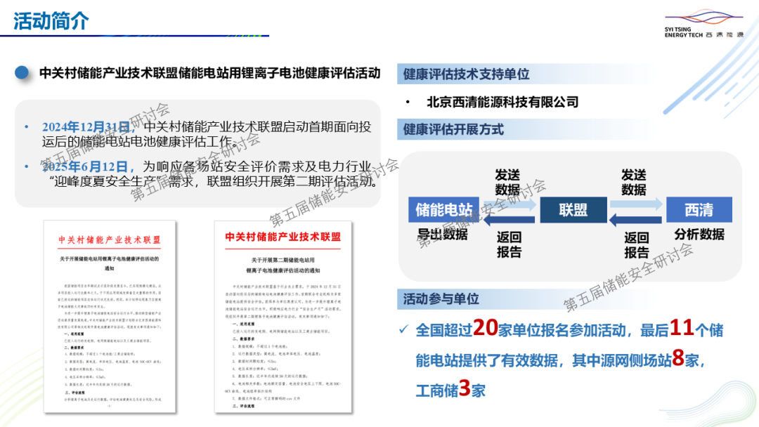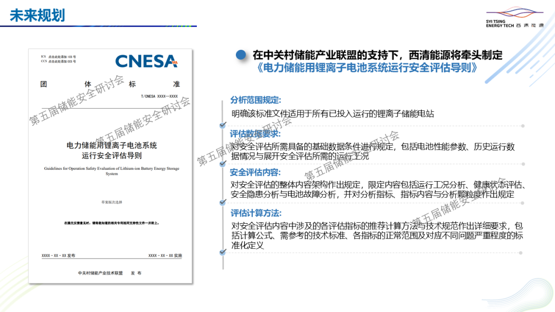 为更好的完善储能电站评估状态,在中关村储能产业联盟的支持下,西清能源将牵头制定《电力储能用锂离子电池系统运行安全评估导则》,对基于数据分析的储能电池系统安全评估的数据要求、评估内容和计算方法进行规范。欢迎业内同行共同参与制定标准,推动行业安全治理体系的升级。
