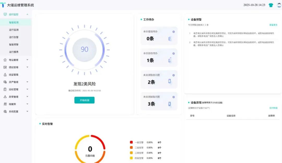 在安全保障及高效运行维度,平台构筑了行业领先的资产安全防护体系,依托实时监测与AI大数据分析能力,提前30分钟精准识别热失控、容量衰减等潜在风险,实现无损预警。所有预警信号直连运维系统,形成“采集-监测-诊断-预警-运维-反馈”的高效闭环管理机制,在全面保障人员与资产安全、延长设备寿命的同时,凭借精准定位与快速响应,显著提升运维效率、降低运营成本,最终达成资产安全与经济效益的协同最优。