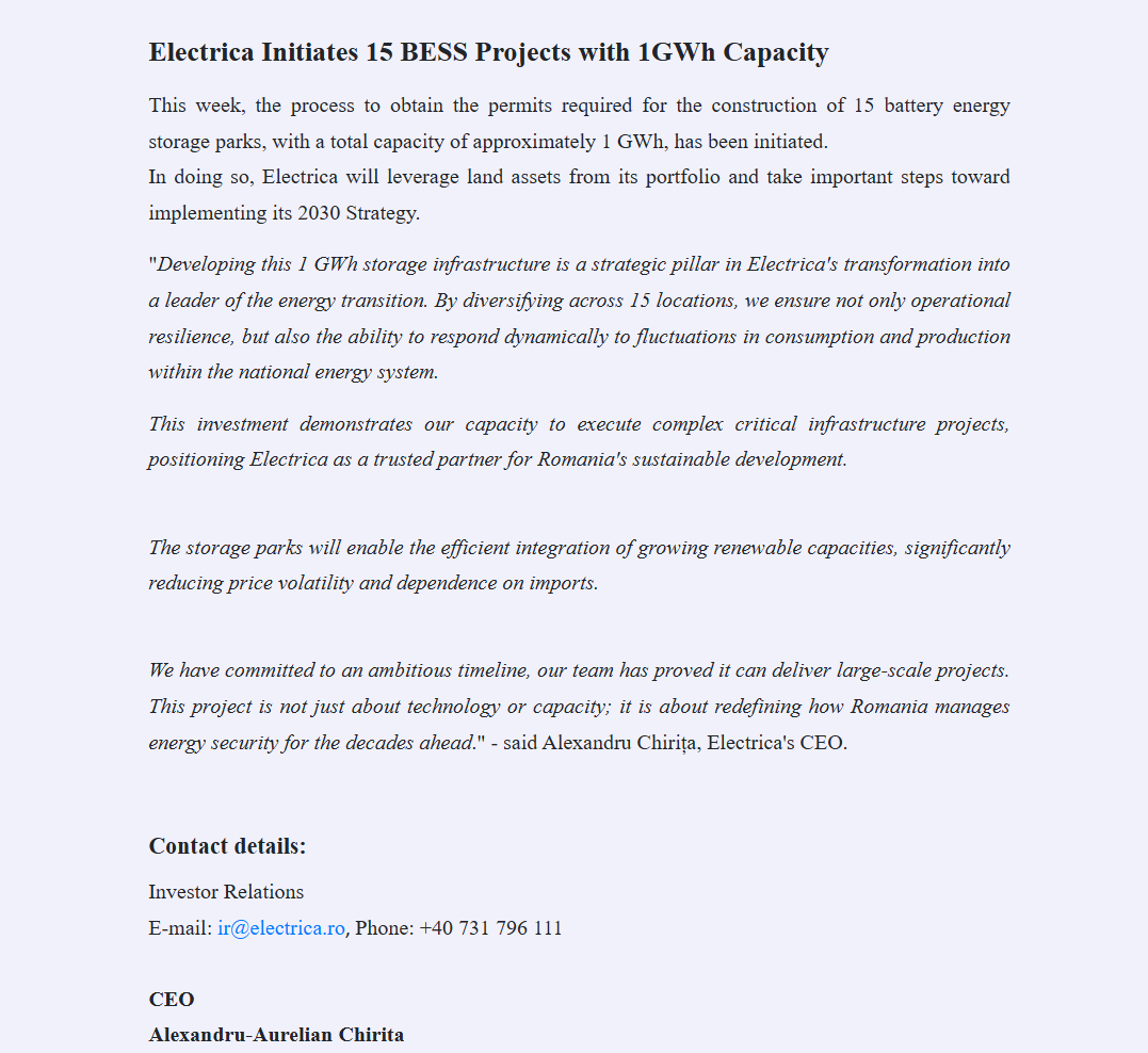 这些储能园区建成后将高效整合可再生能源产能、降低价格波动并减少对进口的依赖。助力Electrica 转变为能源转型领域的领军者。