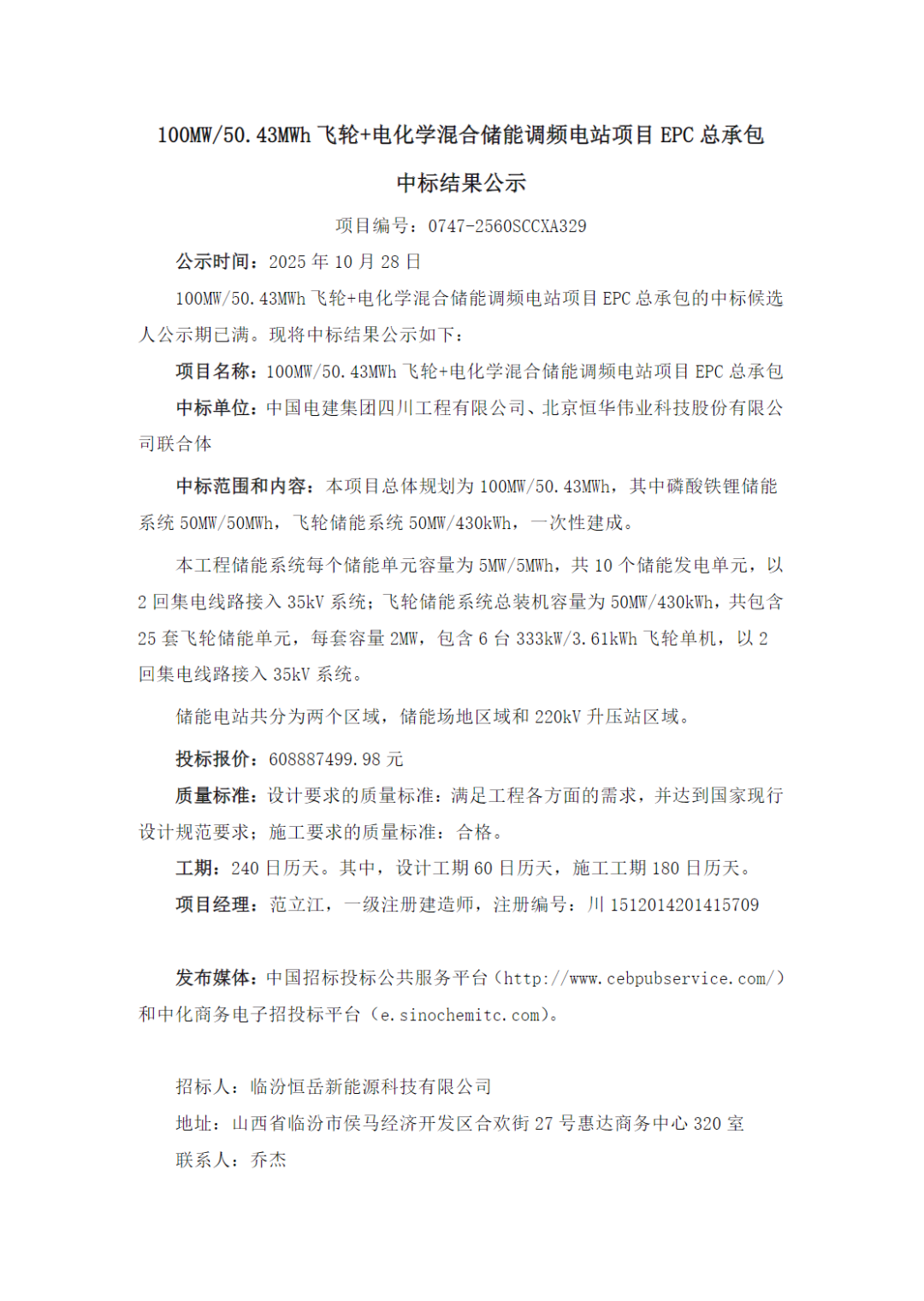 碳索储能网获悉,10月28日,临汾恒岳新能源科技有限公司发布中标公告:100MW/50.43MWh飞轮+电化学混合储能调频电站项目EPC总承包由中国电建集团四川工程有限公司、北京恒华伟业科技股份有限公司联合体中标。