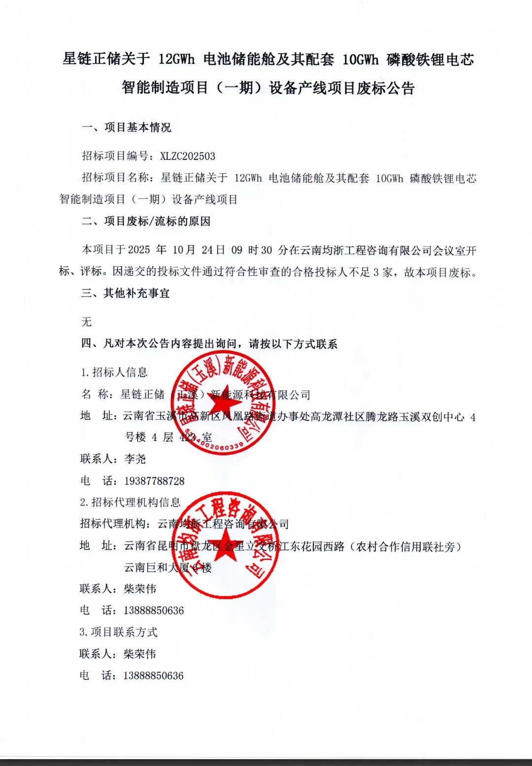 碳索储能网获悉,10月28日,星链正储发布关于12GWh电池储能舱及其配套10GWh磷酸铁锂电芯智能制造项目(一期)设备产线项目废标公告。