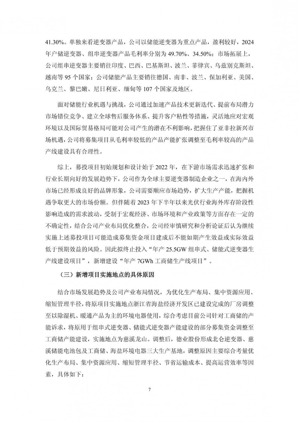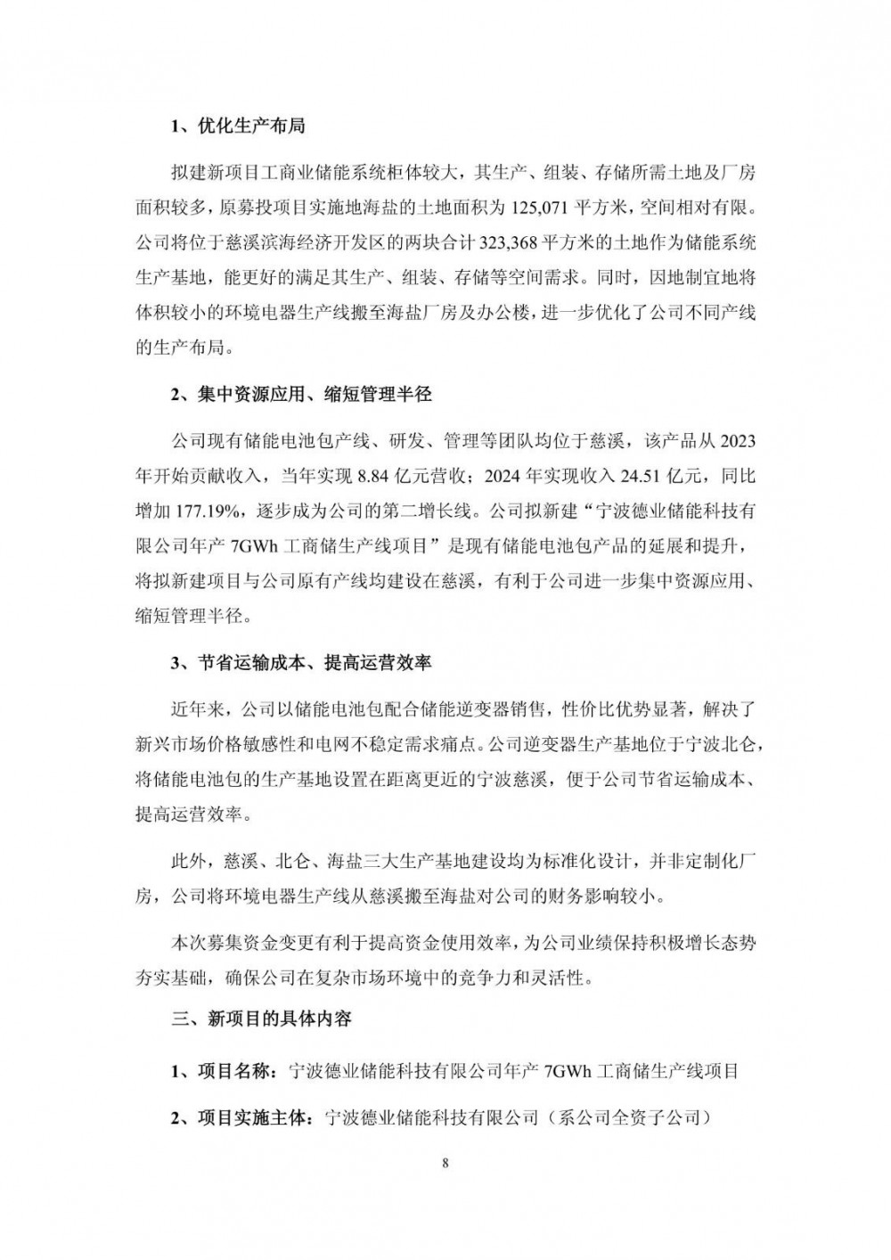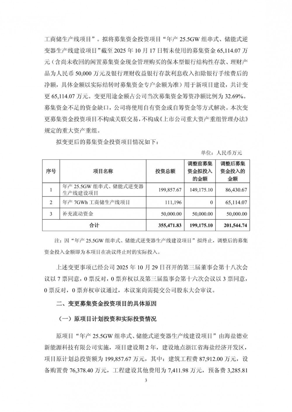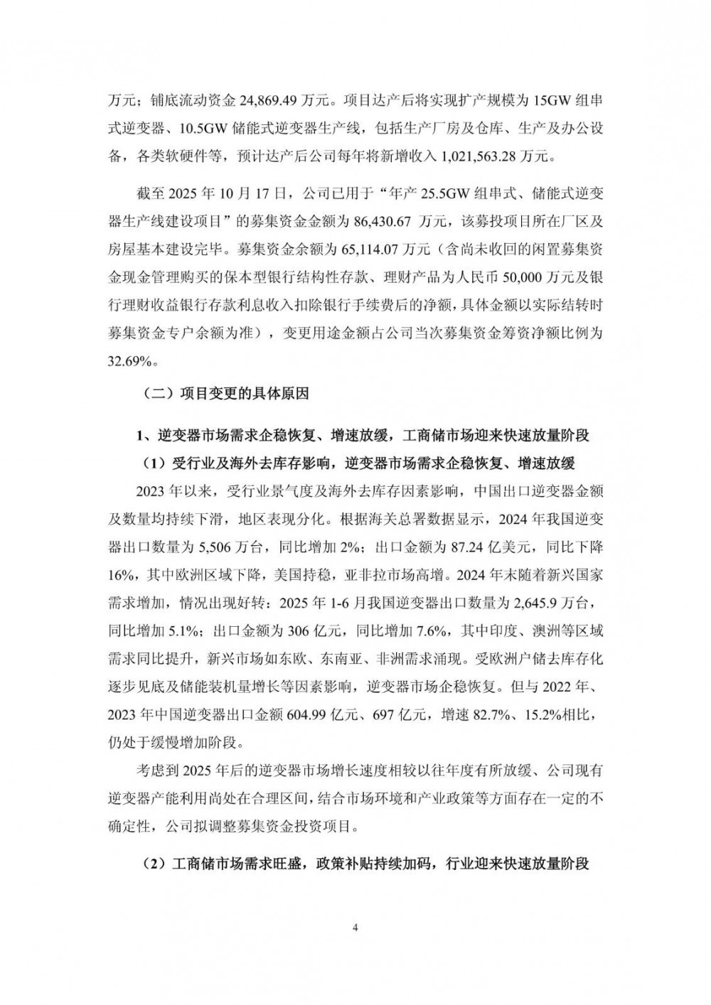 原项目名称为年产25.5GW组串式、储能式逆变器生产线建设项目;新项目名称及投资总金额为年产7GWh工商储生产线项目,投资总金额为人民币111,196万元,新项目计划建设期为2年,预计建设完工后投产。
