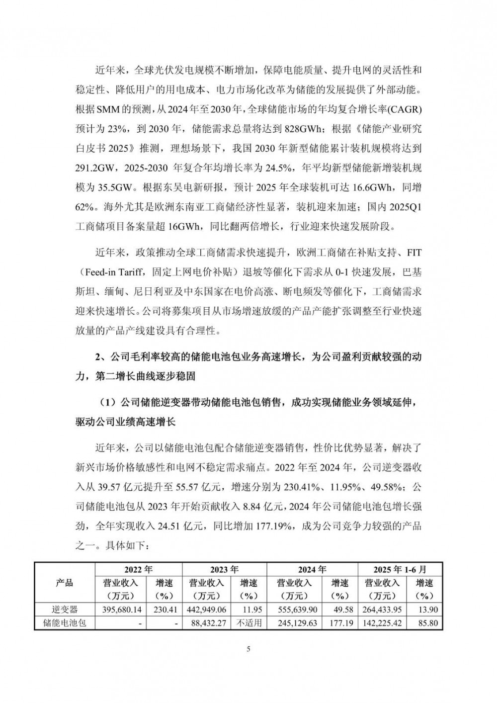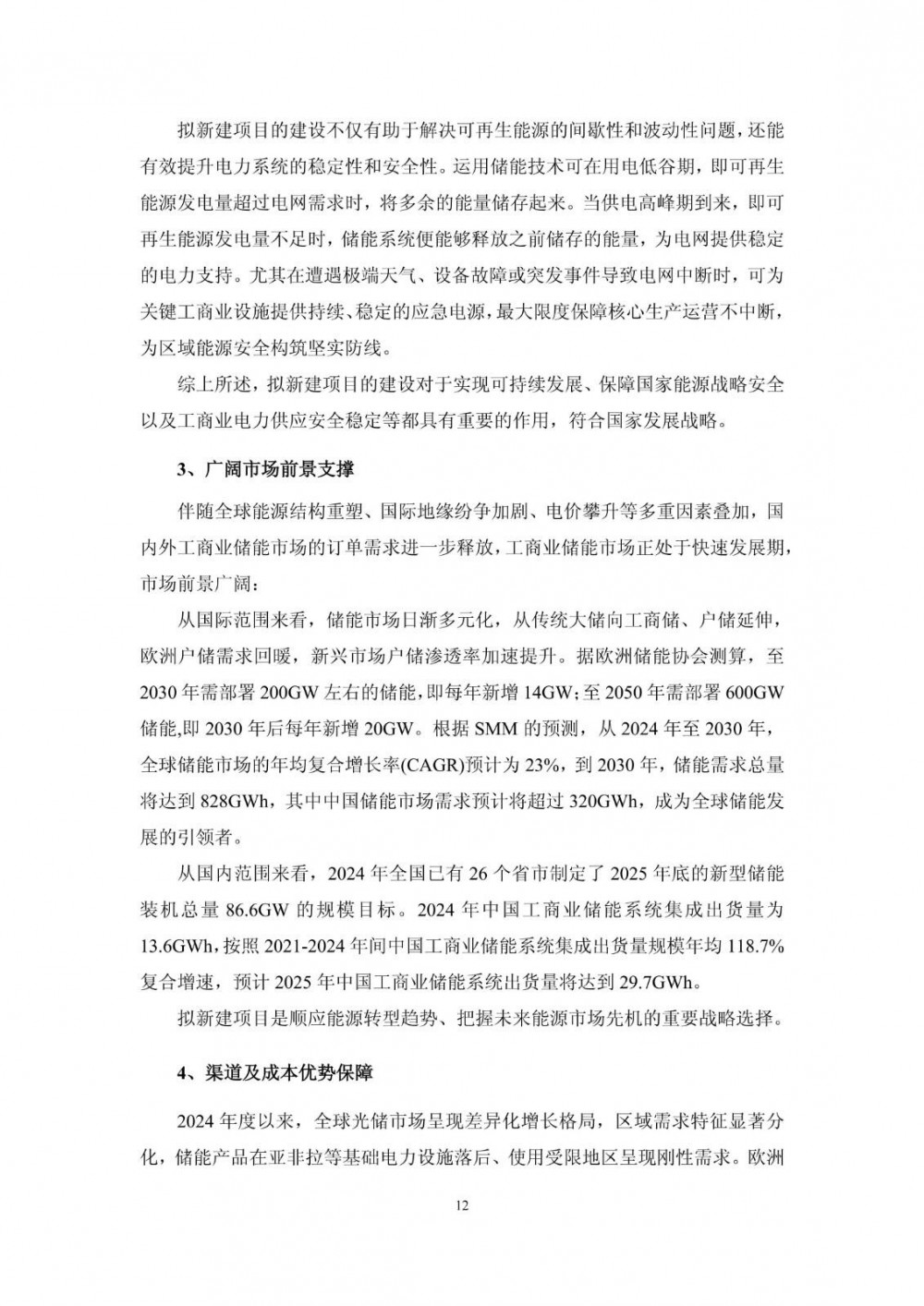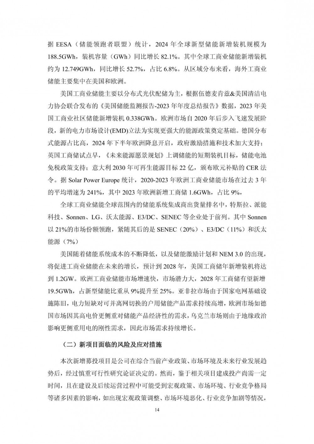 近年来,政策推动全球工商储需求快速提升,欧洲工商储在补贴支持、FIT(Feed-inTariff,固定上网电价补贴)退坡等催化下需求从0-1快速发展,巴基斯坦、缅甸、尼日利亚及中东国家在电价高涨、断电频发等催化下,工商储需求迎来快速增长。公司将募集项目从市场增速放缓的产品产能扩张调整至行业快速放量的产品产线建设具有合理性。