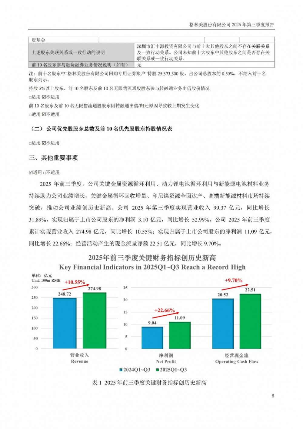 10月30日,格林美发布2025年三季度报告。公司2025年第三季度实现营业收入99.37亿元,同比增长31.89%,实现归属于上市公司股东的净利润3.10亿元,同比增长52.99%。公司2025年前三季度累计实现营业收入274.98亿元,同比增长10.55%;实现归属于上市公司股东的净利润11.09亿元,同比增长22.66%;经营活动产生的现金流量净额22.51亿元,同比增长9.70%。