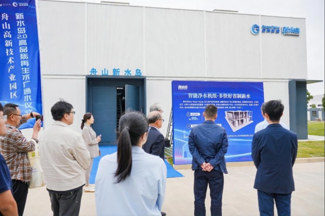 通水仪式结束后,与会人员共同实地考察了新水岛2.0水厂。该项目占地面积仅300平方米,采用金科环境自主研发的“新水岛2.0”工程模块化产品与“水萝卜AI智能体”运营管理平台,以污水处理厂出水为水源,通过“超滤+反渗透”先进处理工艺,使供水水质远超《城市污水再生利用—工业用水水质》标准,完全满足国内外光伏企业高标准生产用水需求。项目总设计产水规模达2万吨/天,其中一期产水规模5000吨/天,服务范围覆盖舟山高新区内新能源、化工等重点工业企业,目前一期产出的再生水已主要供应园区内光伏企业,为当地新能源产业发展注入了绿色动力。