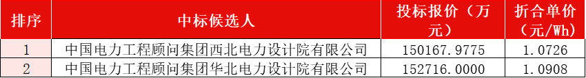 项目第一中标候选人为中国电力工程顾问集团西北电力设计院有限公司,投标报价1501679775.00元,折合中标单价1.072元/Wh;