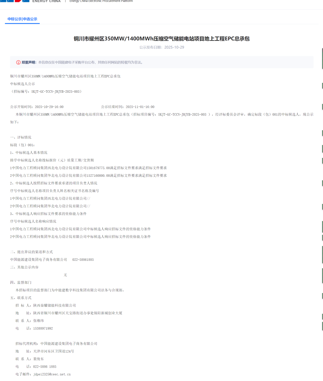 碳索储能网获悉,10月29日,中国能建电子采购平台发布铜川市耀州区350MW/1400MWh压缩空气储能电站项目地上工程EPC总承包中标公示。