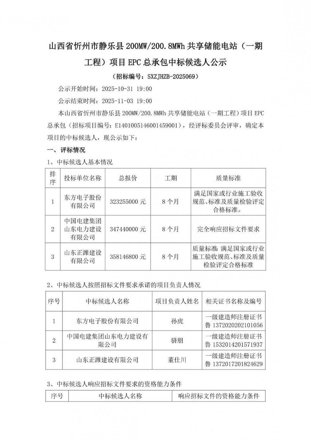 10月31日,山西省忻州市静乐县200MW/200.8MWh共享储能电站(一期工程)项目EPC总承包中标候选人公示。