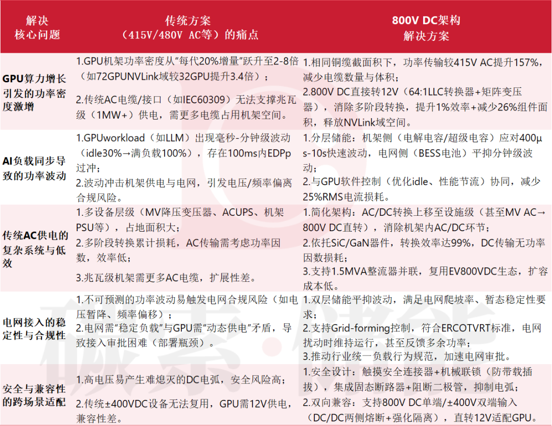 与传统的415V/480V AC(交流电)数据中心供电方案相比,英伟达800V DC(直流电)架构解决了数据中心五大关键问题:一是GPU算力增长带来的服务器功率激增;二是AI负载导致的功率剧烈波动;三是交流供电中,冗杂的系统与低效率;四是电网稳定;五是安全性与兼容性。