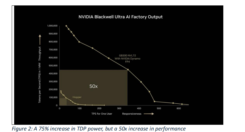 Hopper架构升级到GB300架构后。TDP功耗仅增长75%,性能增长了50倍。