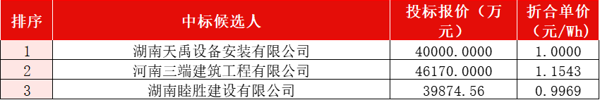 项目第一中标候选人为湖南天禹设备安装有限公司,投标报价40000.00万元,折合单价1元/Wh;