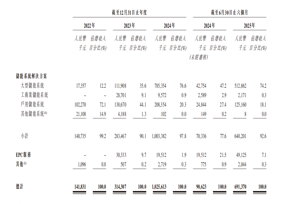 截至2022年、2023年、2024年12月31日,果下科技储能系统产品的年产能分别为72.8MWh、349.7MWh、2,363.9MWh。最大收入贡献由2022年占总收入72.1%的欧洲市场户用储能系统产品及解决方案,转变为2024年占总收入76.6%的中国大型储能系统产品及解决方案。