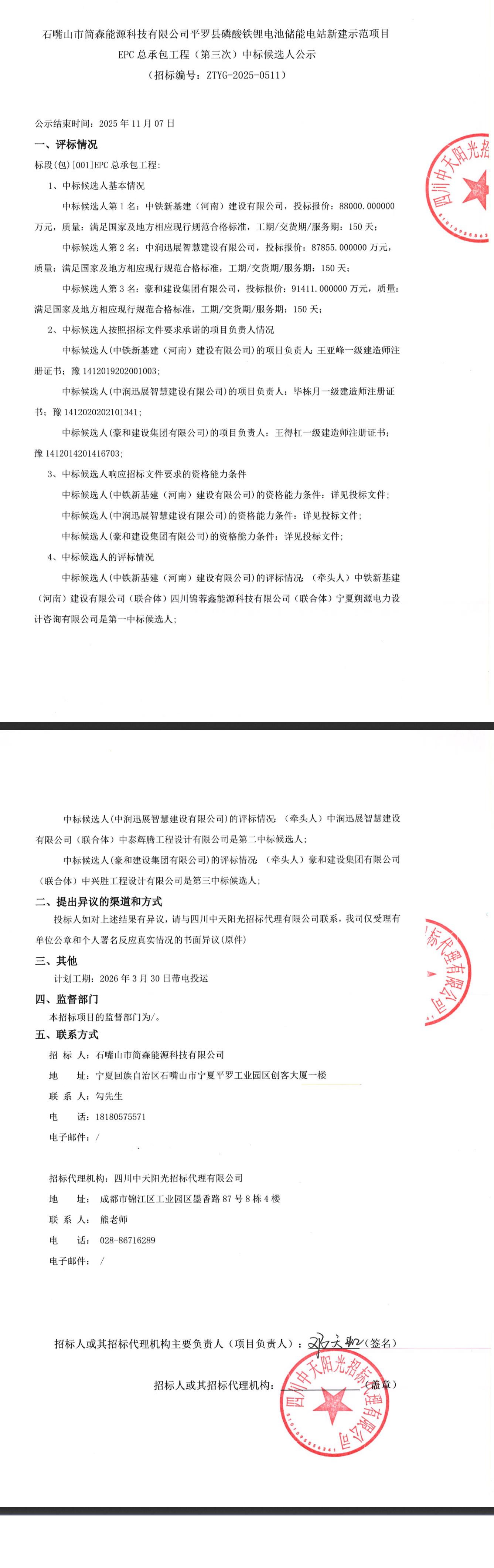 11月4日,石嘴山市简森能源科技有限公司平罗县磷酸铁锂电池储能电站新建示范项目EPC总承包工程(第三次)中标候选人公示。