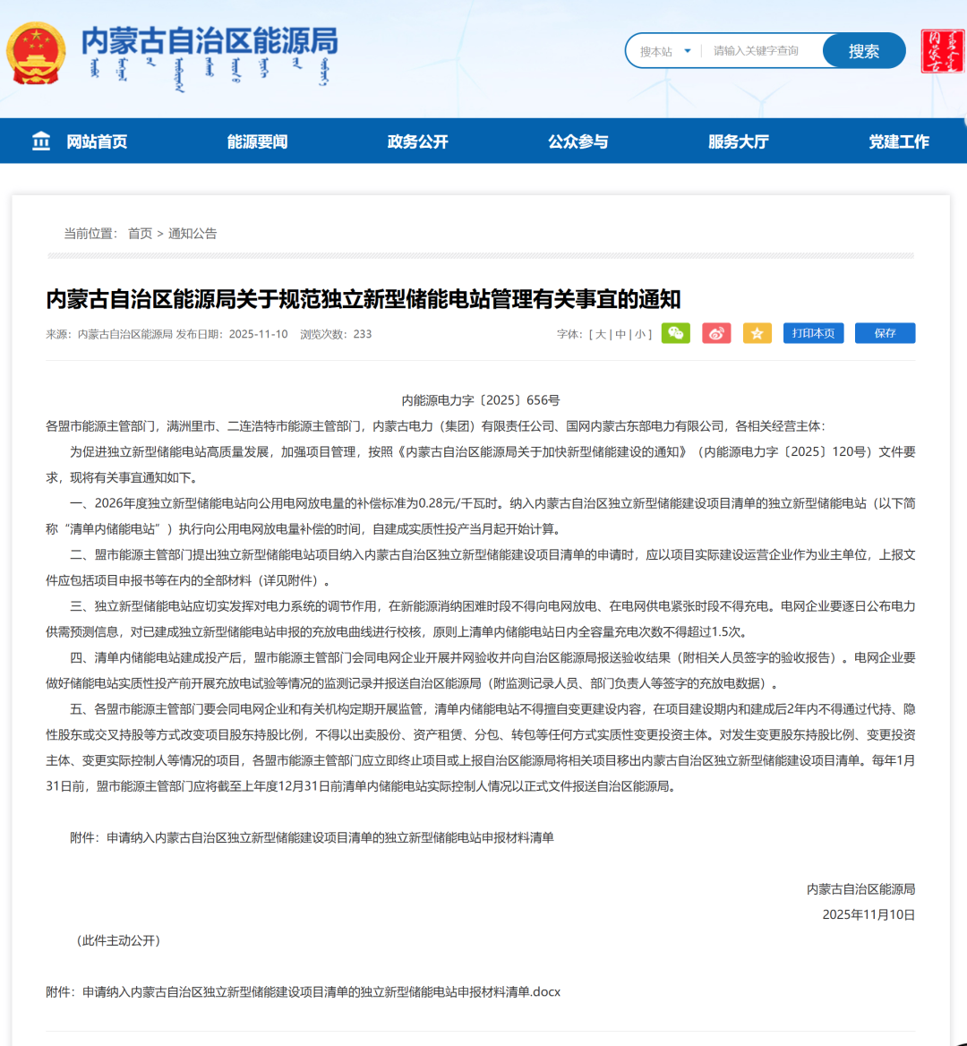 11月10日,内蒙古能源局发布《内蒙古自治区能源局关于规范独立新型储能电站管理有关事宜的通知》。