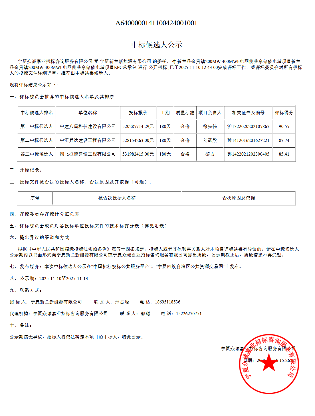11月10日,贺兰县金贵镇200MW/400MWh电网侧共享储能电站项目EPC总承包中标候选人公示。