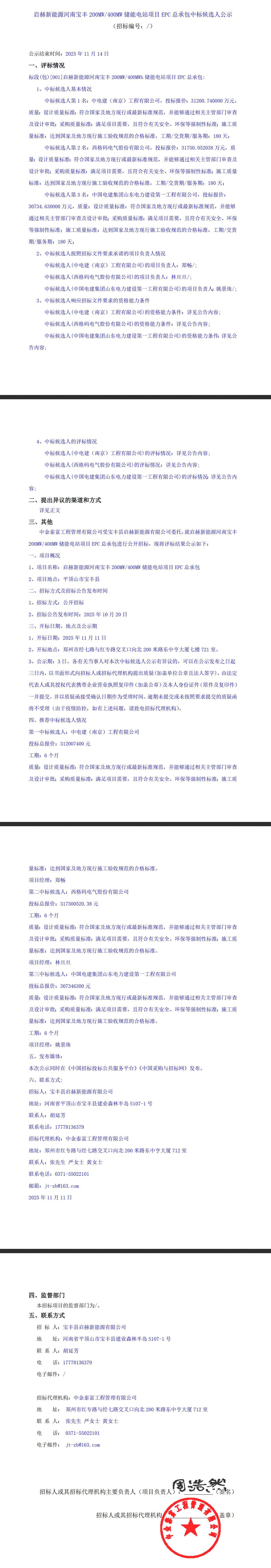 11月11日,启赫新能源河南宝丰200MW/400MW储能电站项目EPC总承包中标候选人公示。