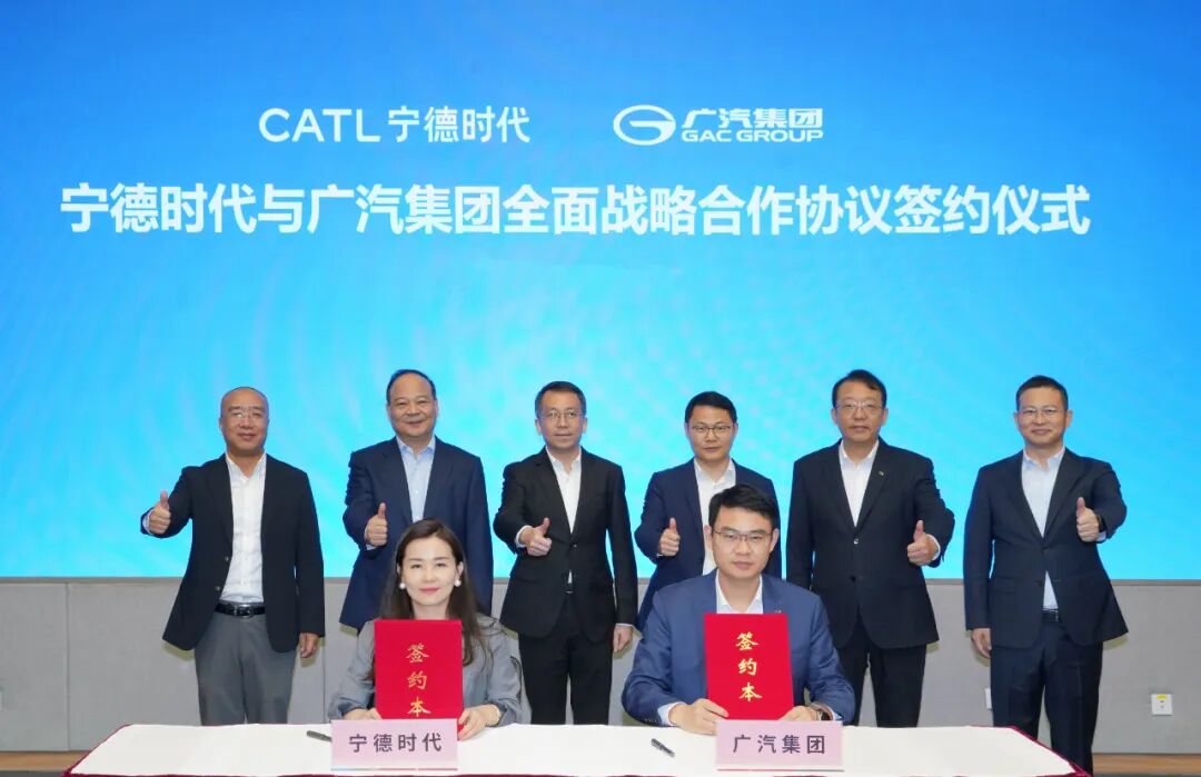 宁德时代董事长兼CEO曾毓群、市场体系联席总裁韩伟以及广汽集团董事长、总经理冯兴亚、副总经理閤先庆等嘉宾共同见证签约仪式。宁德时代国内乘用车副总裁罗慧萍与广汽集团产品本部本部长张雄代表双方签署协议。
