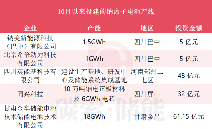 近日,超过20GWh钠离子电池产能接连落户河南、四川、北京、湖南等地,。10月,安徽GW级钠离子电池生产线进入量产阶段。11月4日,中国石化与LG化学签约,联合开发钠离子电池正极、负极等关键材料。