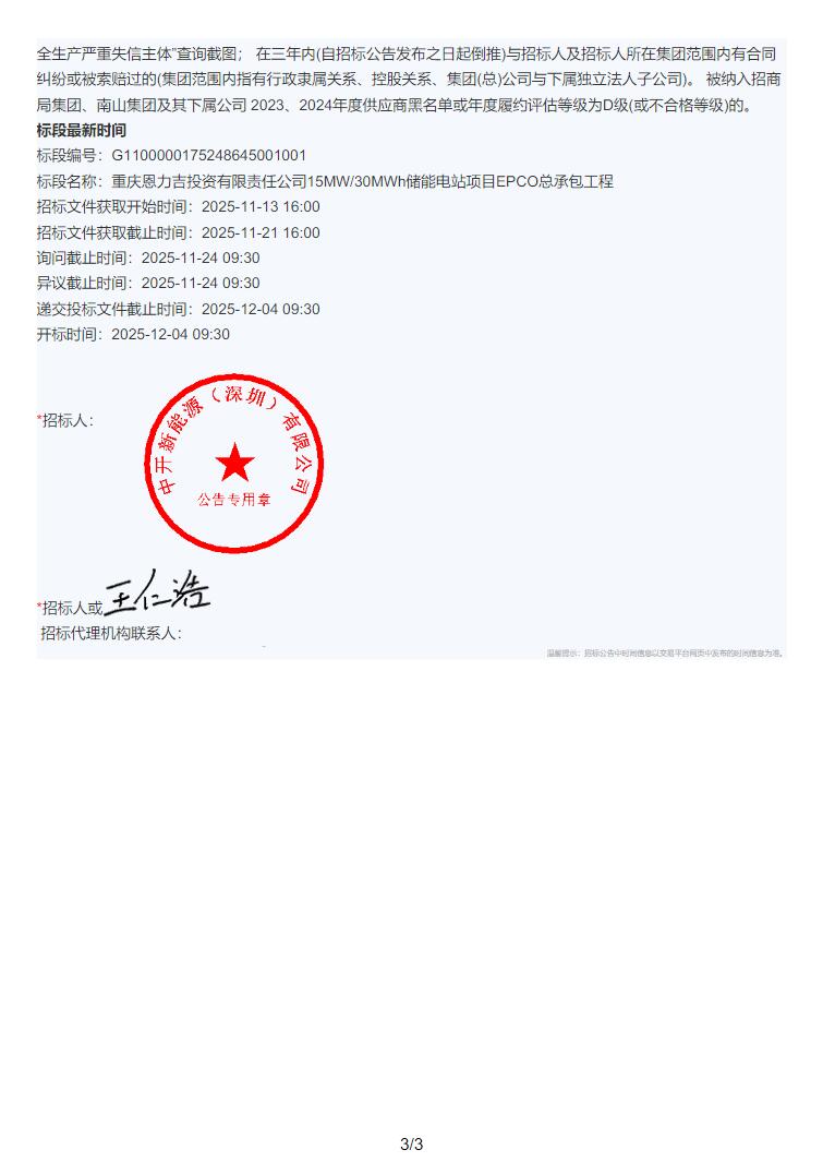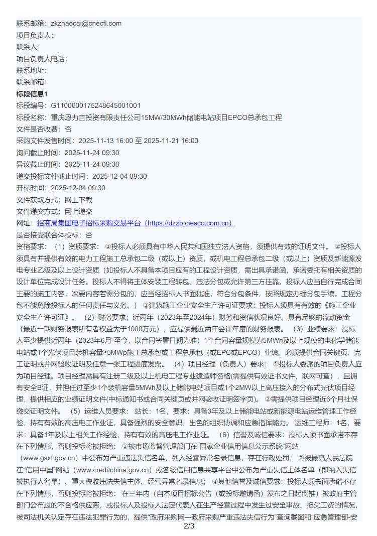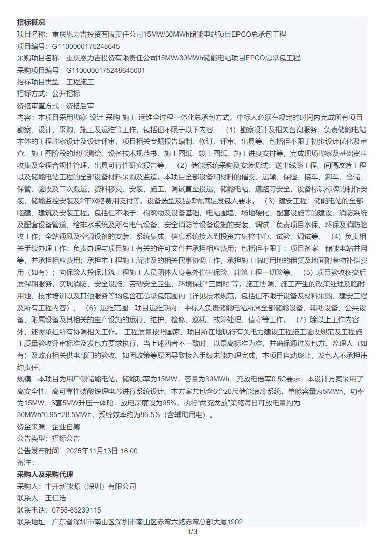 11月13日,重庆恩力吉投资有限责任公司15MW/30MWh储能电站项目EPCO总承包工程招标公告发布。