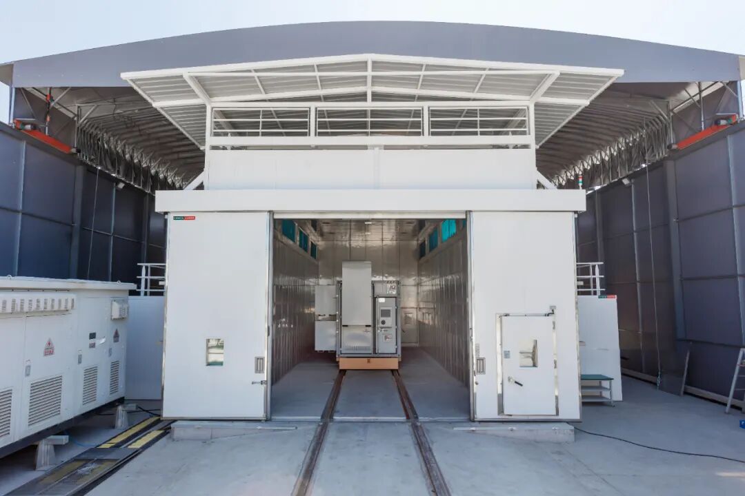 在西侧试验场内建立的两座行业领先的超大型环境舱拥有单舱478 m³超大空间,可容纳包含直流舱及中压一体舱在内的40ft的子系统,在-50℃至+90℃极端温度与25%~98%RH湿度之间进行全环境模拟测试。天合在业内首次提出满载条件下环境舱的温度规范,确保产品在环境舱内满功率运行时,舱内温差始终控制在±4℃内。