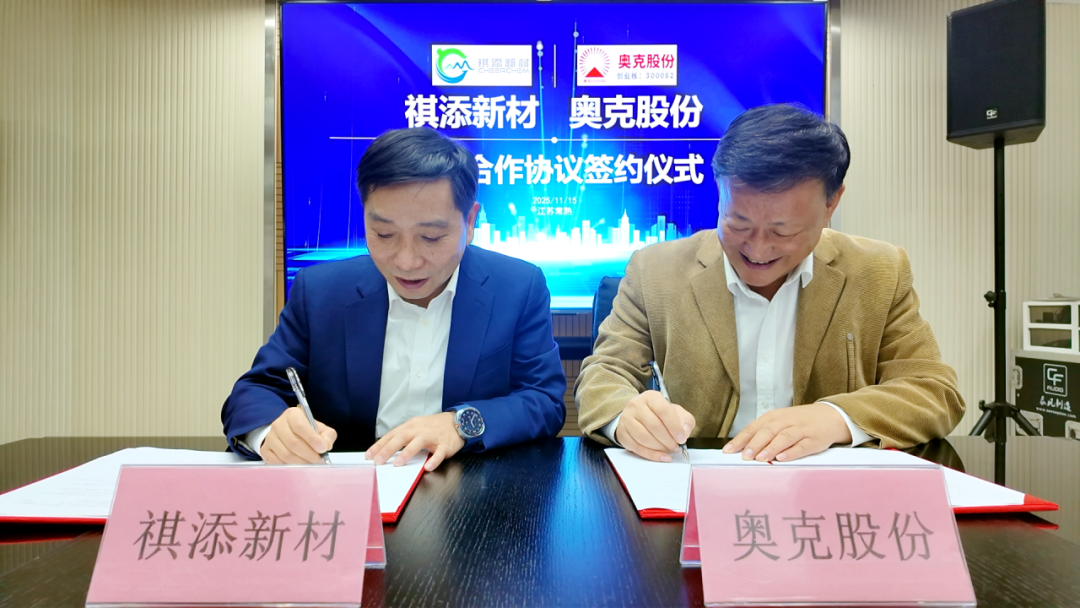 2025年11月15日,江苏常熟——祺添新材与奥克股份正式签署战略合作协议,标志着双方在新能源材料领域的合作迈入新阶段。祺添新材董事长傅人俊、总经理游立志,奥克股份董事长朱建民、总裁朱宗将等高层共同出席签约仪式。