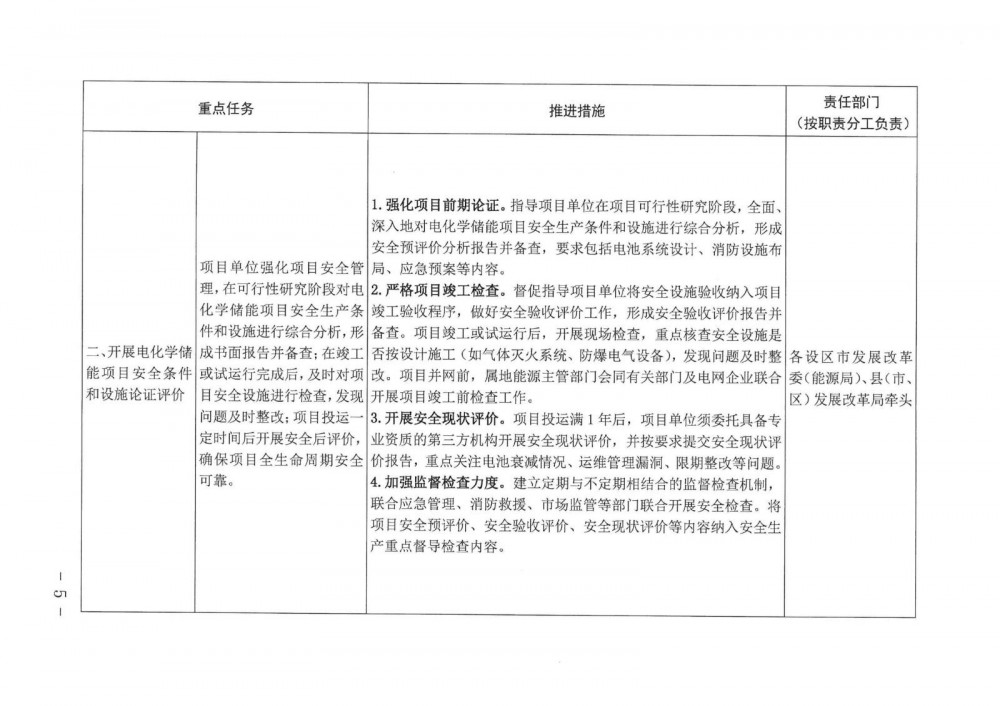 文件提出,加强项目前期安全论证。项目单位应在可行性研究阶段,对电化学储能项目的安全生产条件及设施开展全面、深入的综合分析,编制安全预评价分析报告,内容应包括但不限于电池选型与系统设计、消防设施配置与布局、应急预案与应急处置流程等,并留存备查。