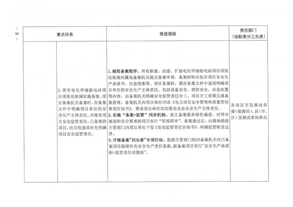 (二)规范项目备案管理。所有新建、改建、扩建电化学储能电站项目须依法依规向属地发展改革部门提交备案申请,备案材料应包含项目安全生产承诺书、应急预案等。项目备案时,需在备案文件中逐项明确项目单位的安全生产主体责任,包括设备安全、消防安全、应急处置等内容。对已备案项目,应组织开展备案“回头看”,限期补充完善安全生产责任条款。